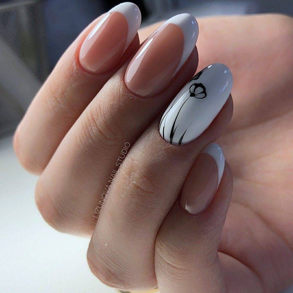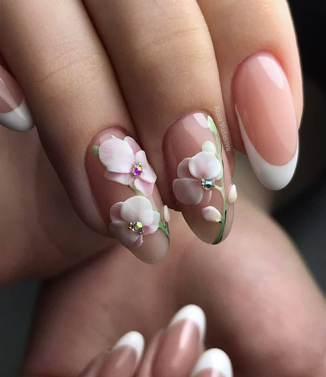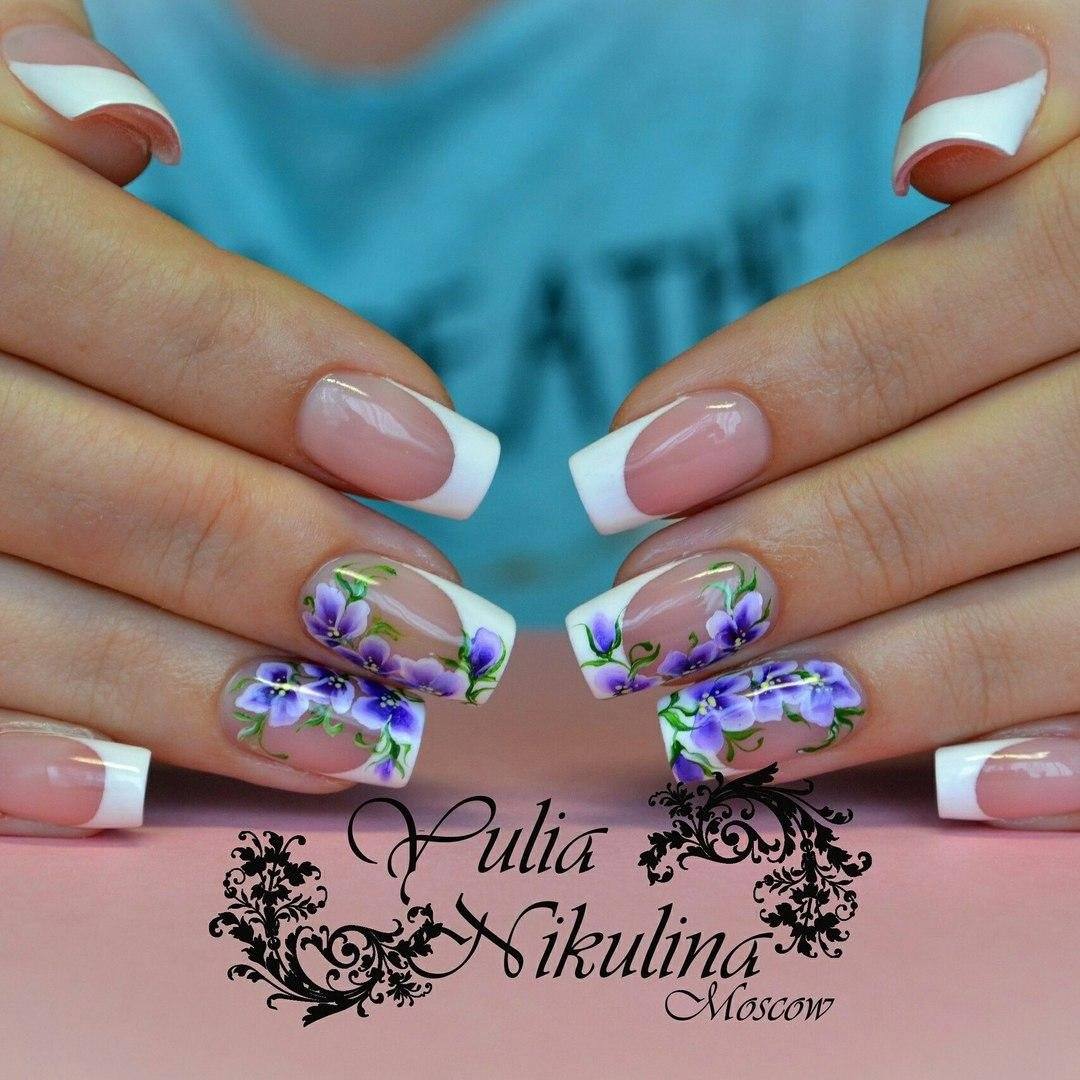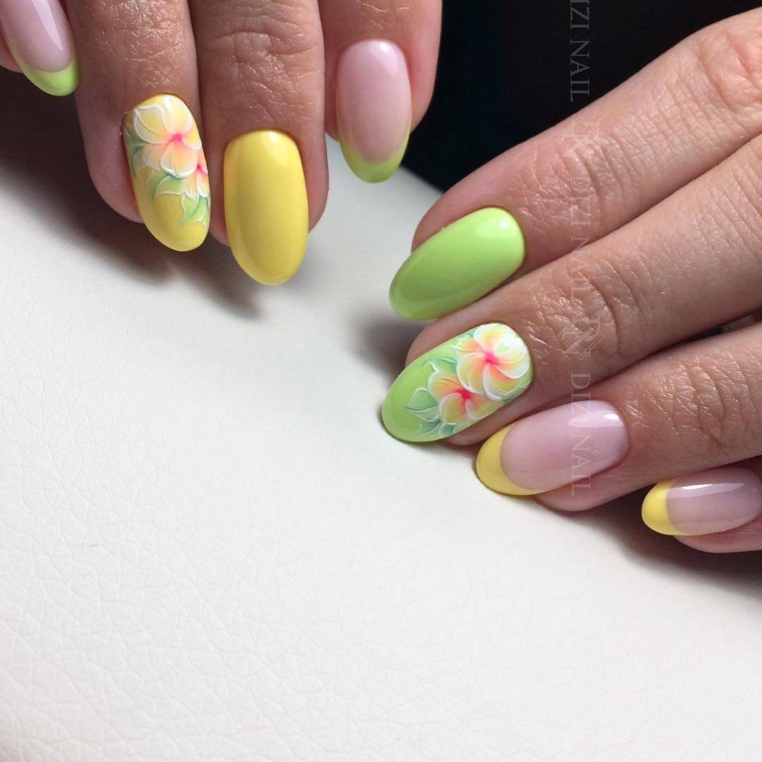 Ноготки можно украсить яркими и масштабными композициями, интересно расположив при этом составляющие части рисунка на нескольких пальчиках или дополнить маникюр аккуратными веточками или бутонами в стиле минимализм. Шикарно смотрится жёлтый френч с цветочными узорами на акцентном безымянном пальчике или рисунками, выполненными акриловой пудрой в тон улыбки. Дополнительно можно прорисовать цветения блестящими полосками глиттера или украсить детали изображения бусинами или стразами.