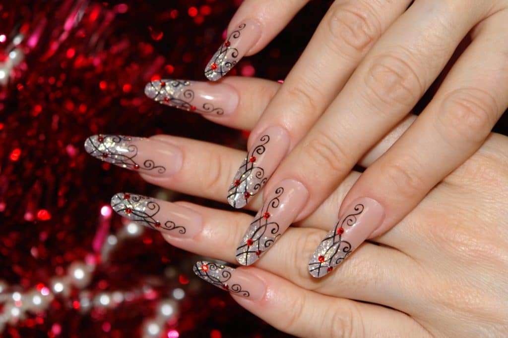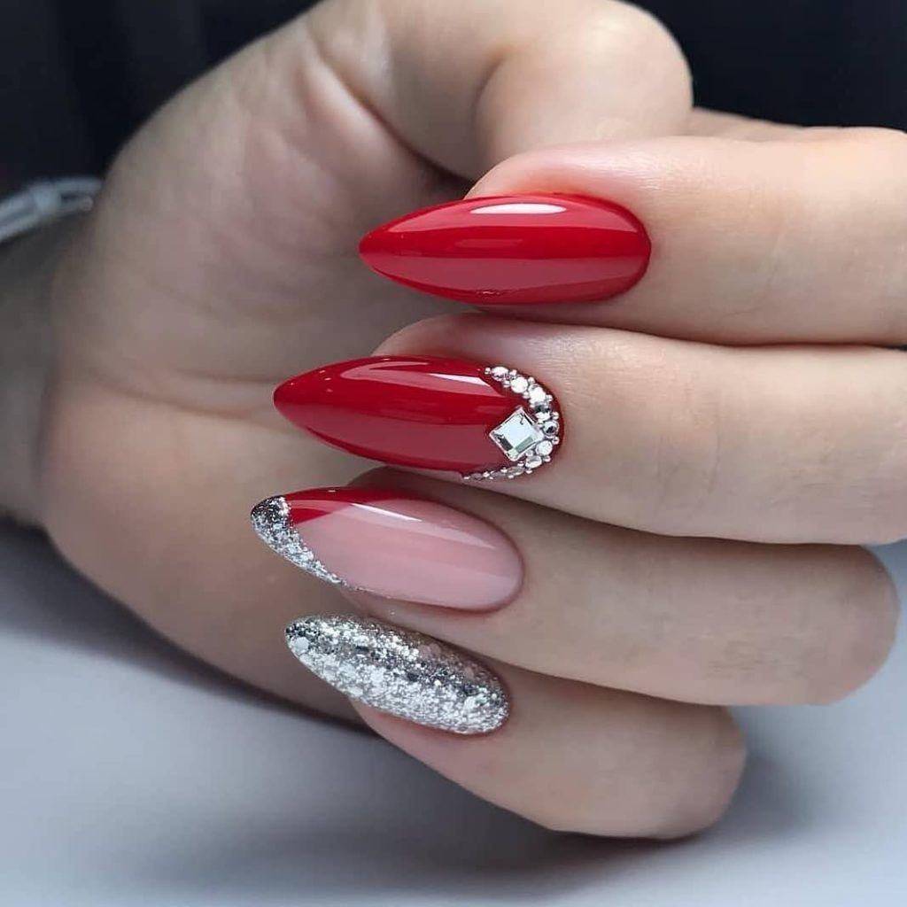 Под красный цвет можно использовать как серебряный глиттер, так и золотой. Последний вариант предпочтителен для торжественных образов. При этом не стоит переусердствовать с блестящим декором, чтобы не превратить дизайн в цыганские мотивы.