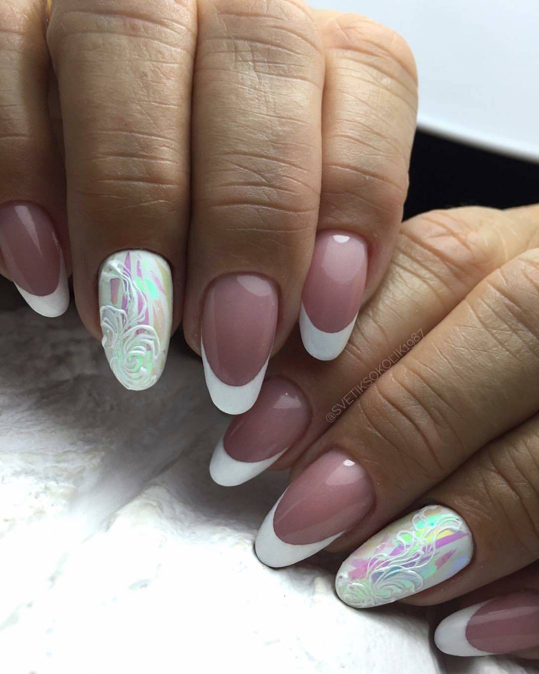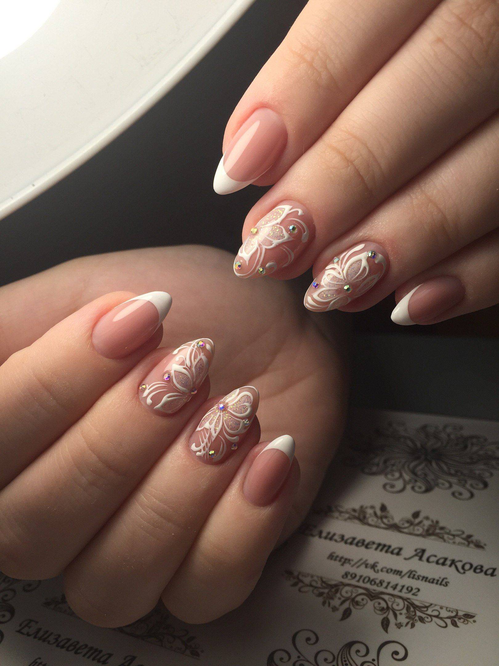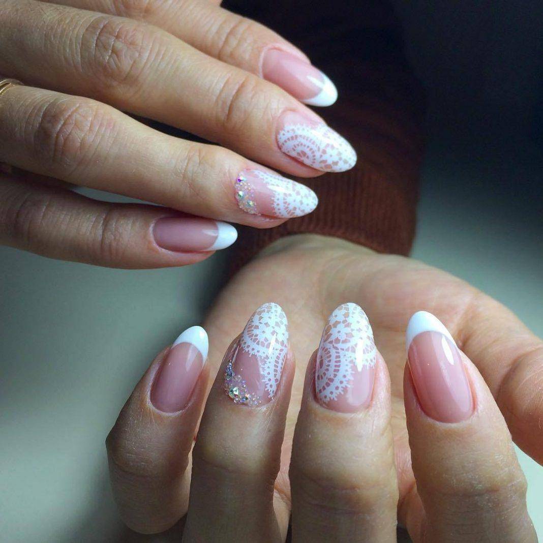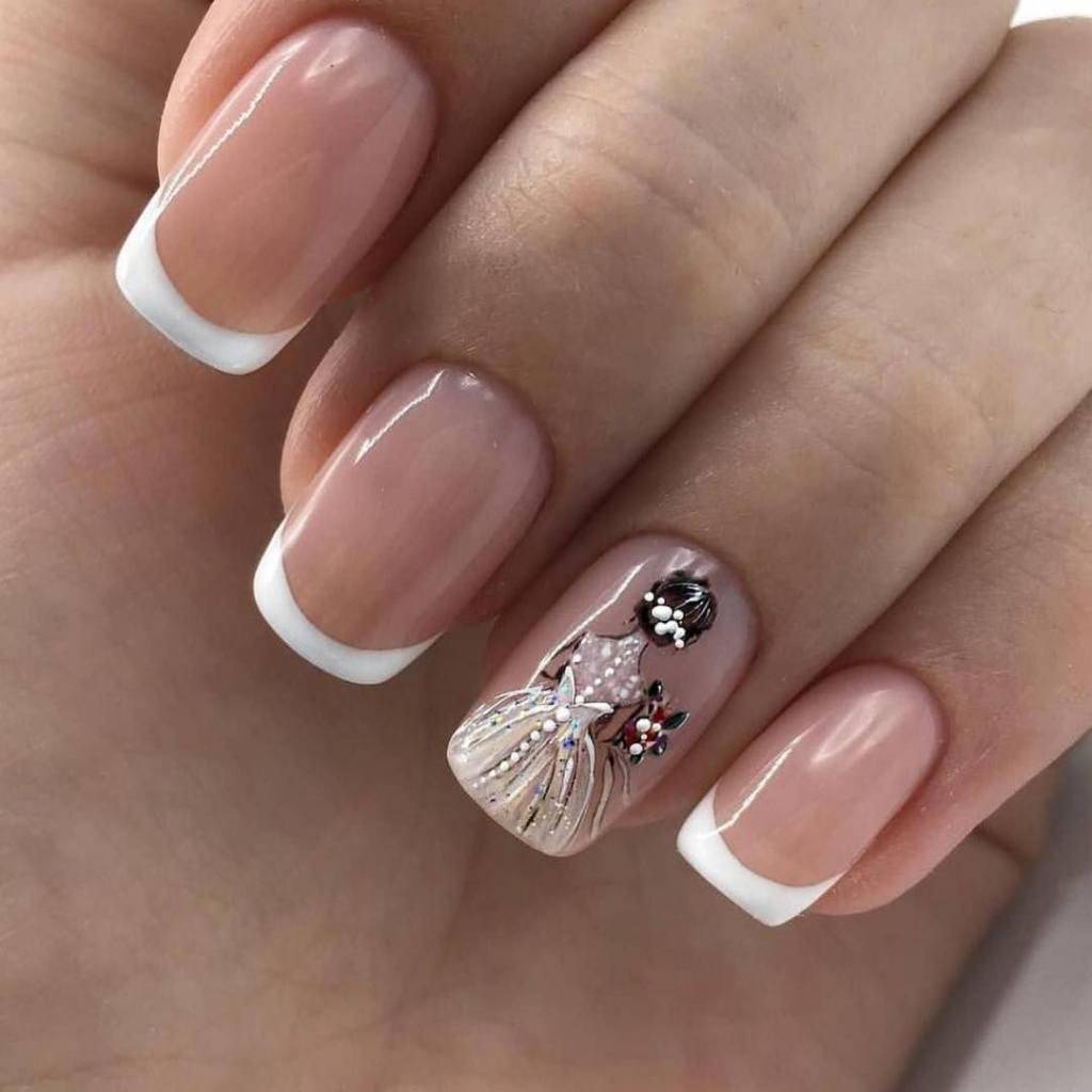 Нежный французский маникюр актуален в любое время года и к любому образу. Все чаще мастера нейл-дизайна предлагают его разнообразить необычным дизайном. Нежный френч создают с помощью нежно-розового, серого и бежевого цветов. Если вы хотите разнообразить нежный френч, то украсьте его ажурным рисунком. Такой рисунок делают как на отдельном ноготке, так и на всех. Нежный французский маникюр сочетается с камнями и блестками. При этом вы должны помнить, что всего этого должно быть не много, так как френч должен оставаться нежным, а не вызывающим. Такой маникюр дополнит образ любой невесты.