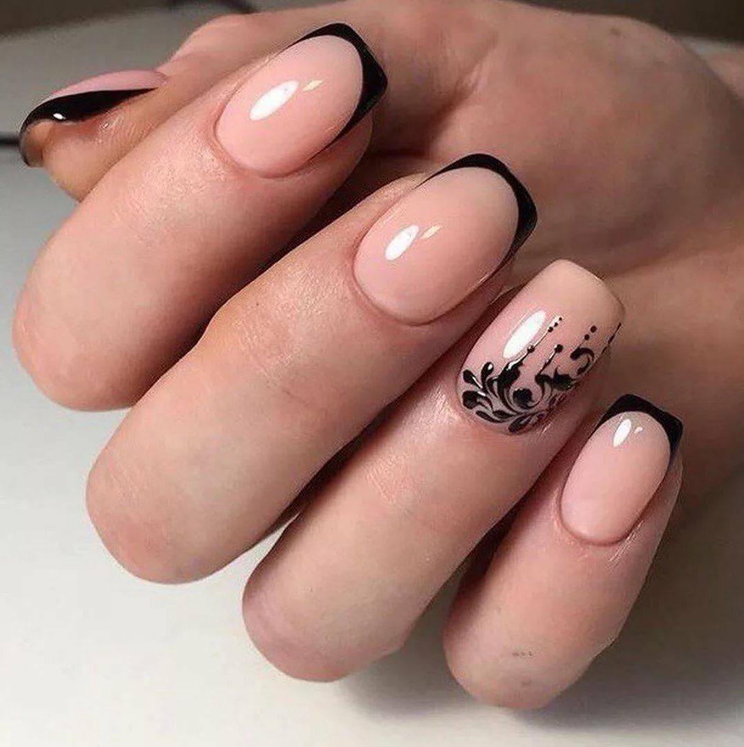 Фантазия рушит все возможные границы. Используя приём полупрозрачности с цветовыми вкраплениями, можно наносить на ногтевую пластину любые формы: от хаотично разбросанных точек до геометрических фигур по контуру. Это могут быть разноцветные линии или чёрные вкрапления. Такой дизайн на прозрачном покрытии подчёркивает смелость и личный вкус, делает маникюр неповторимым.
