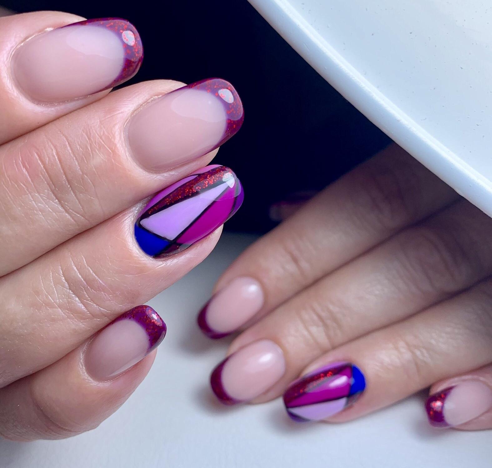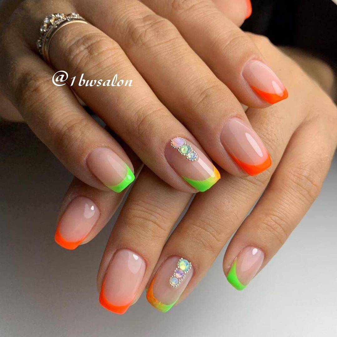 - покрытие каждого ноготка в отдельный яркий цвет с классической прорисовкой края ногтевой пластины