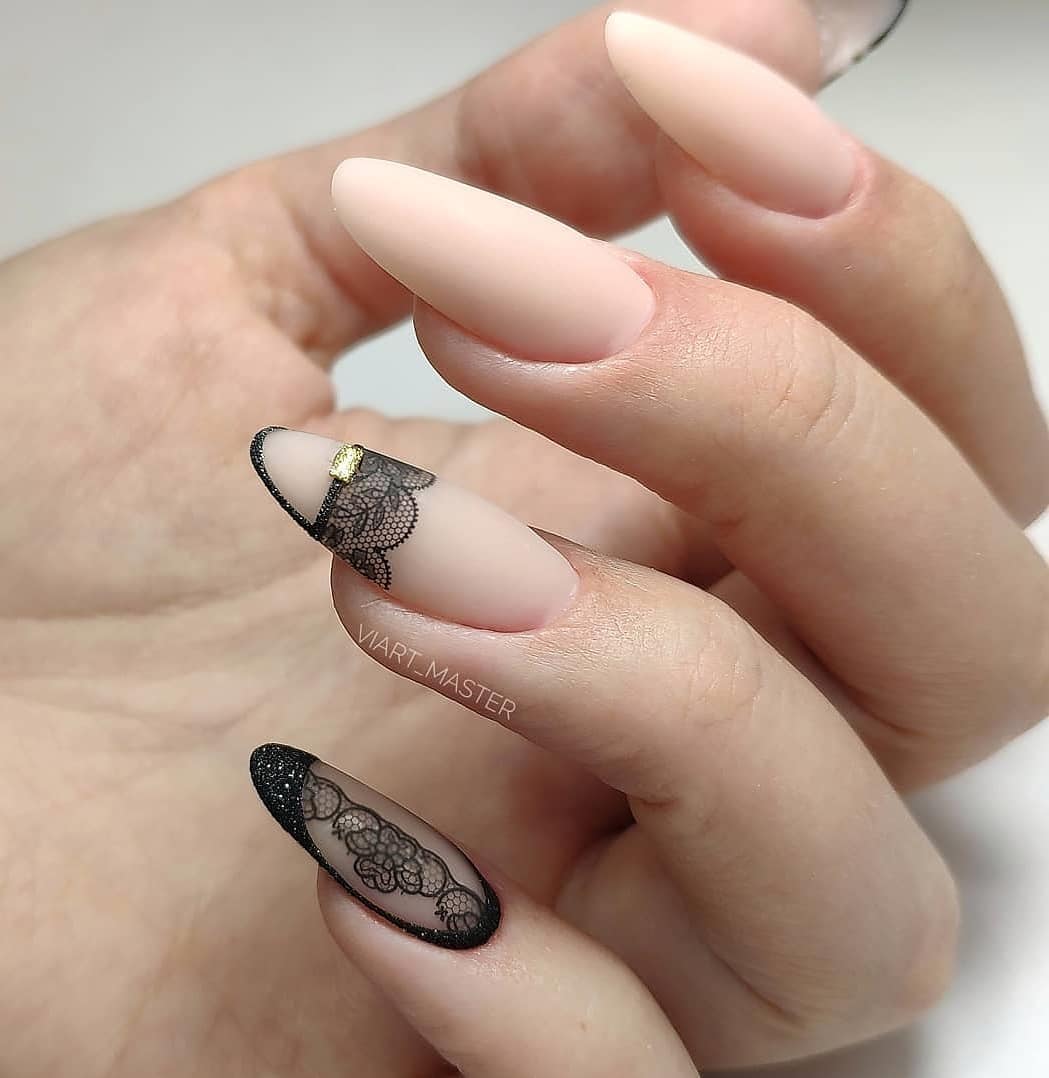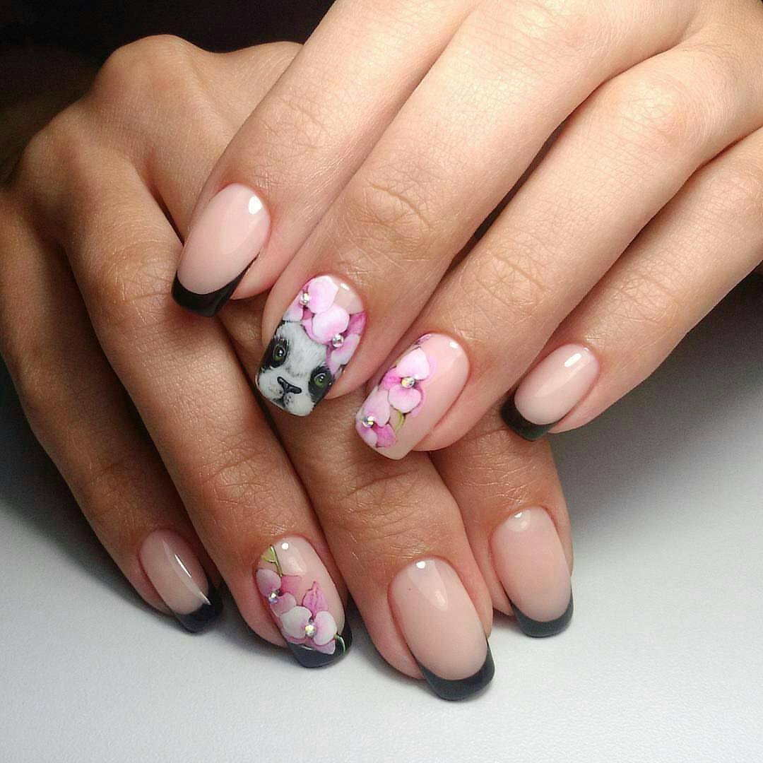 Декор для длинных ногтей подбирается исходя из основного оттенка, сезона и тематики нейл-арта. Одинаково красиво на длинных ногтях выглядит геометрия, ажурные узоры, дымка, выкладка стразами и т.д. Что касается флористики, то акцент сместился с ярких слайдеров на утонченные узоры в темном цвете с бутонами и листочками. Также красиво смотрится флористика с помощью аэрографии. Узор получается нежным и плавным.