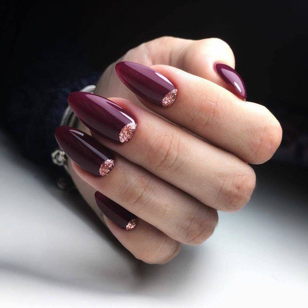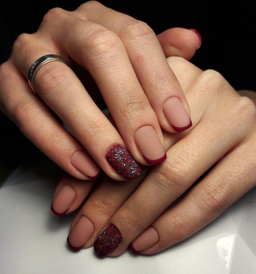 Френч с блестками выполняется в классических бело-розовых тонах, в темных оттенках, в белом, бордовом, черном и других выразительных цветах. Дизайн с незначительным количеством блесток станет отличным решением для делового, повседневного и торжественного образов.