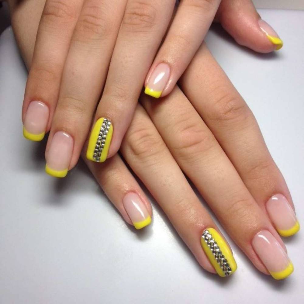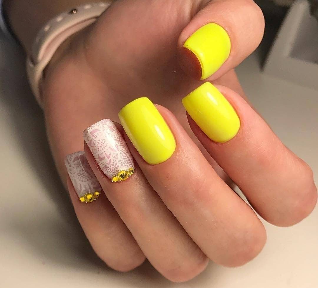Как мы уже упоминали, желтый цвет достаточно лаконичный и легкий, поэтому лишнего декора ему не помешает. Если вы хотите получить стильный и привлекательный нейл-арт без лишних деталей, когда дополните его парой миниатюрный страз.