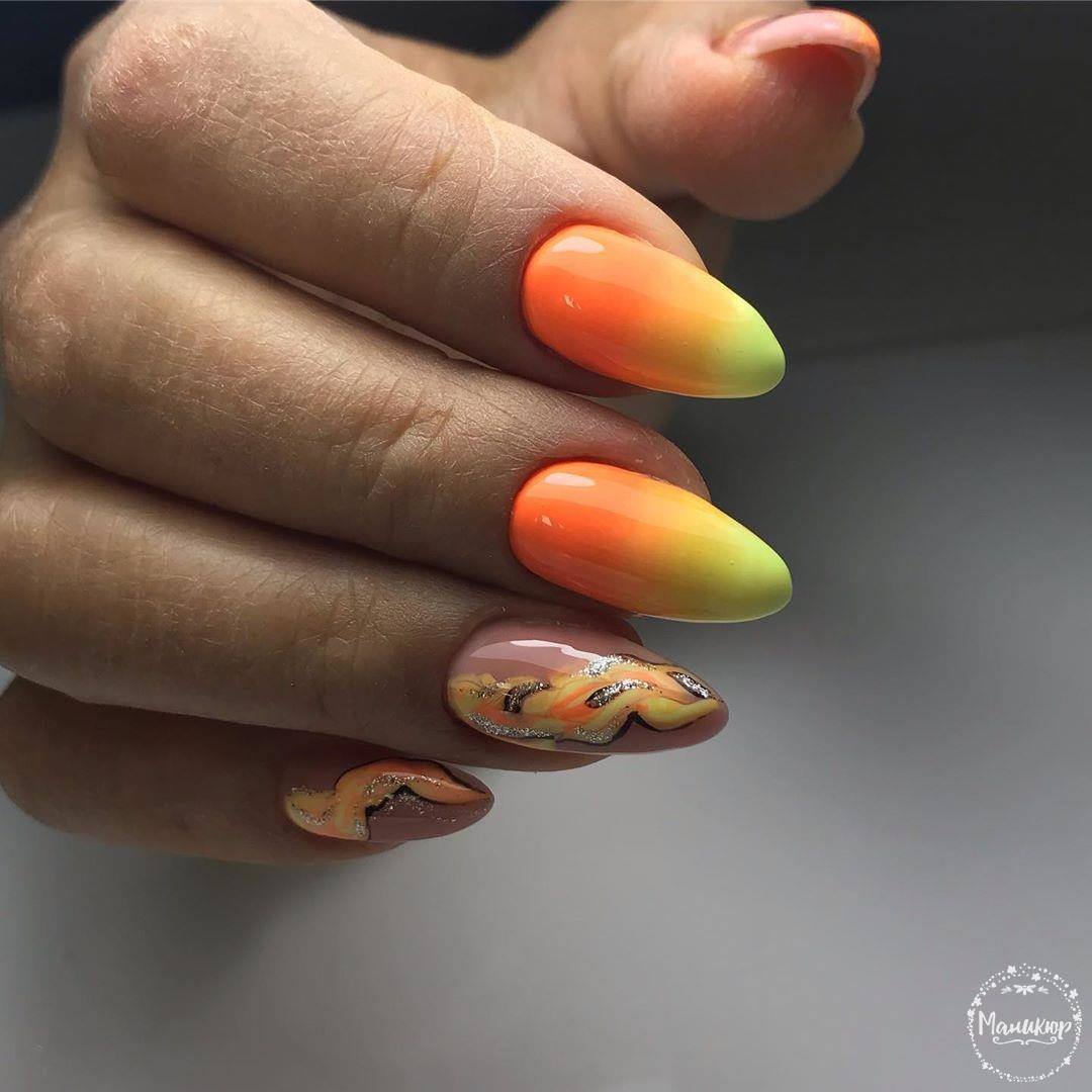 Этот дизайн всегда разный и всегда получается. Ведь когда кисть скользит по непросушенному гель-лаку, как-то само собой получается красивое переплетение оттенков. Сейчас модно комбинировать желтый с серым, оливковым, голубым и синим, сиреневым и розовым. Настало время экспериментов.