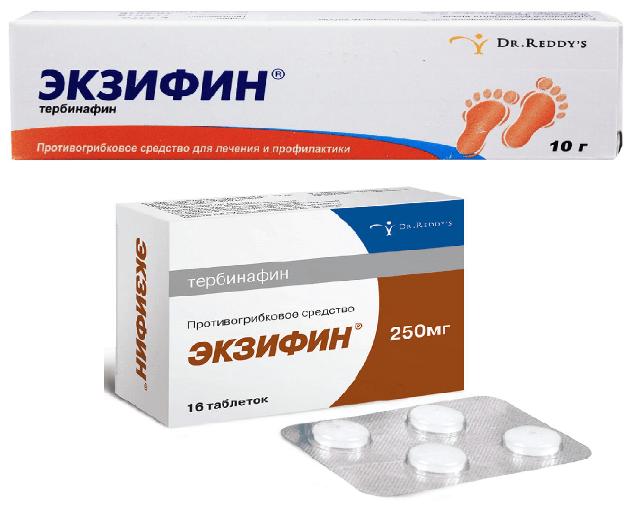 Помимо крема терапевтическая линейка Экзифин содержит и другую лекарственную форму — таблетки. У них более широкий спектр применения, в который включены онихомикозы, или грибковые поражения ногтей. А относительно недавно аптечный ассортимент пополнился одноименным гелем. Он менее густой, поэтому чаще используется при остро протекающих грибковых инфекциях.
