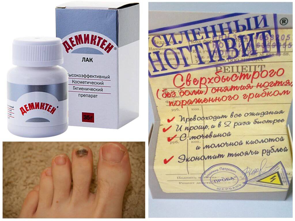 «Демиктин». Эффективное средство, основанное на муравьином альдегиде. Исходя из состава, «неагрессивные» компоненты подходят практически любым категориям людей. В число входят беременные и дети. Наносится лекарственный концентрат на очищенные ногти. Продолжать лечение нужно до тех пор, пока не отрастет новый ноготь. После курса лечения, препарат разрешается наносить в целях профилактики. Стоимость приятная — 300 рублей за флакончик.