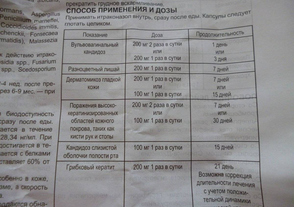 При вульвовагинальном кандидозе – 200 мг 2 раза в сутки в течение 1 дня или 200 мг 1 раз в сутки в течение 3 дней; при отрубевидном лишае – 200 мг/сут в течение 7 дней; при дерматомикозах – 100 мг 1 раз в сутки в течение 15 дней. При поражении кожи кистей, стоп проводят дополнительное лечение в той же дозе в течение 15 дней; при кандидозе слизистой оболочки полости рта – 100 мг 1 раз в сутки в течение 15 дней; при грибковом кератите – 200 мг 1 раз в сутки в течение 21 дня; при онихомикозе – 200 мг/сут в течение 3 мес или повторные курсы по 200 мг 2 раза в сутки в течение 1 нед, с последующими перерывами. При поражении ногтей на ногах (независимо от наличия поражения ногтей на руках) проводят 3 курса лечения по 1 нед, с интервалом 3 нед. При поражении ногтей только на руках проводят 2 курса лечения по 1 нед, с интервалом 3 нед. При системном аспергиллезе – 200 мг/сут в течение 2-5 мес; при необходимости дозу увеличивают до 200 мг 2 раза в сутки. При системном кандидозе – 100-200 мг 1 раз в сутки в течение 3 нед – 7 мес; при необходимости дозу увеличивают до 200 мг 2 раза в сутки.