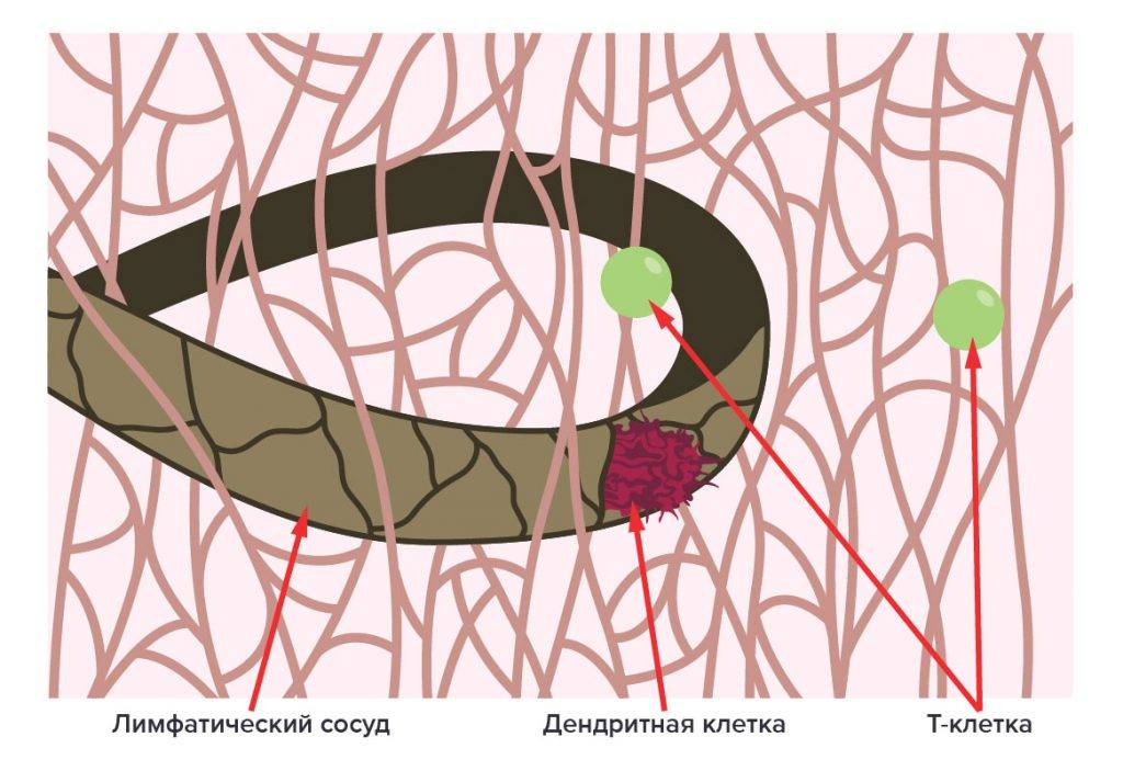 Лимфатические сосуды — водопровод для лимфатической жидкости, которая содержит большое количество иммунных клеток: макрофагов, дендритных клеток, Т-лимфоцитов и др. Дендритные клетки — разведчики, которые обнаруживают чужеродных агентов и передают их Т-лимфоцитам. Т-клетки — солдаты, они борются с патогенными возбудителями. Когда враги побеждены, эти клетки сохраняют в памяти информацию о чужеродных агентах, чтобы помочь организму в будущем бороться с подобными инфекциями.
