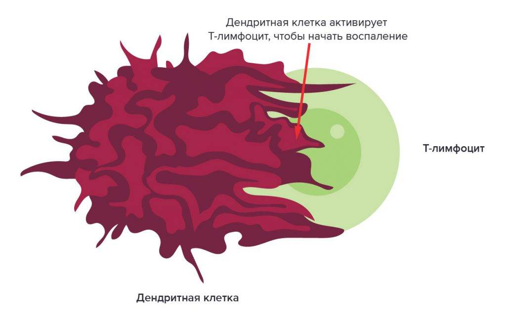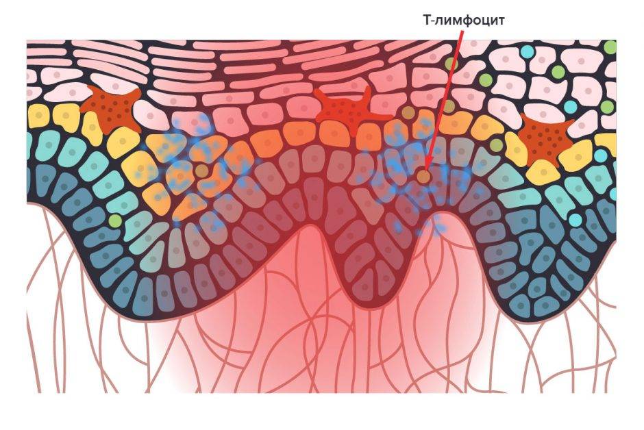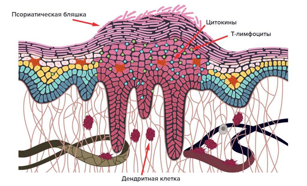 Когда в организме человека развивается псориаз, иммунная система активируется вне зависимости от наличия каких-либо возбудителей. Дендритные клетки ошибочно воспринимают собственные ткани организма за чужеродные вещества и производят сигнальные молекулы — цитокины. Эти молекулы активируют Т-лимфоциты и другие иммунные клетки, которые начинают производить свои цитокины.