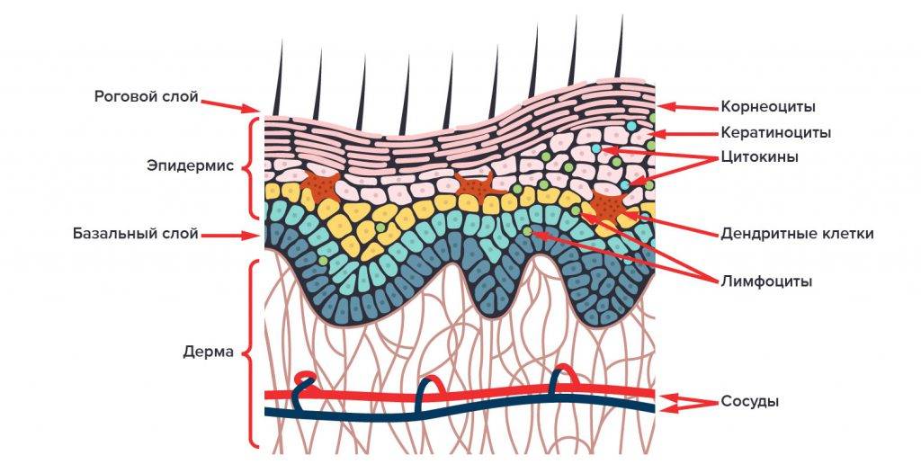 В свою очередь, цитокины стимулируют кератиноциты, заставляя их интенсивно размножаться и вырабатывать свои воспалительные молекулы, на которые реагируют иммунные клетки, и так продолжается до бесконечности. Кератиноциты постоянно делятся, новые вытесняют своих предшественников на поверхность, формируя псориатические бляшки.