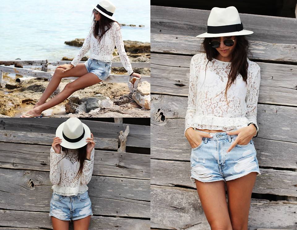 - Голубым денимом. Вещи из небесно-голубого денима станут отличным дополнением к соломенной канотье или Федоре. В таком наряде можно пойти как на прогулку с друзьями так и отправиться на романтическое свидание. На ноги можно надеть гладиаторские сандалии или сабо с открытой пяткой.