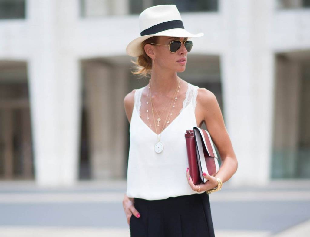 - Чёрным стрейчем. Летом иногда случаются дождливые деньки, в которые так и хочется надеть любимые чёрные скинни из эластичного стрейча. В тандеме с белой майкой на тонких бретелях и рубашкой в красную клетку соломенная Федора будет смотреться очень и очень уместно.