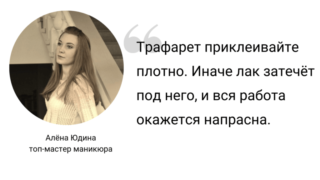 - После аккуратно отклейте трафарет от пластины и наклейте на ноготь, отступив при этом от края ногтя несколько миллиметров.