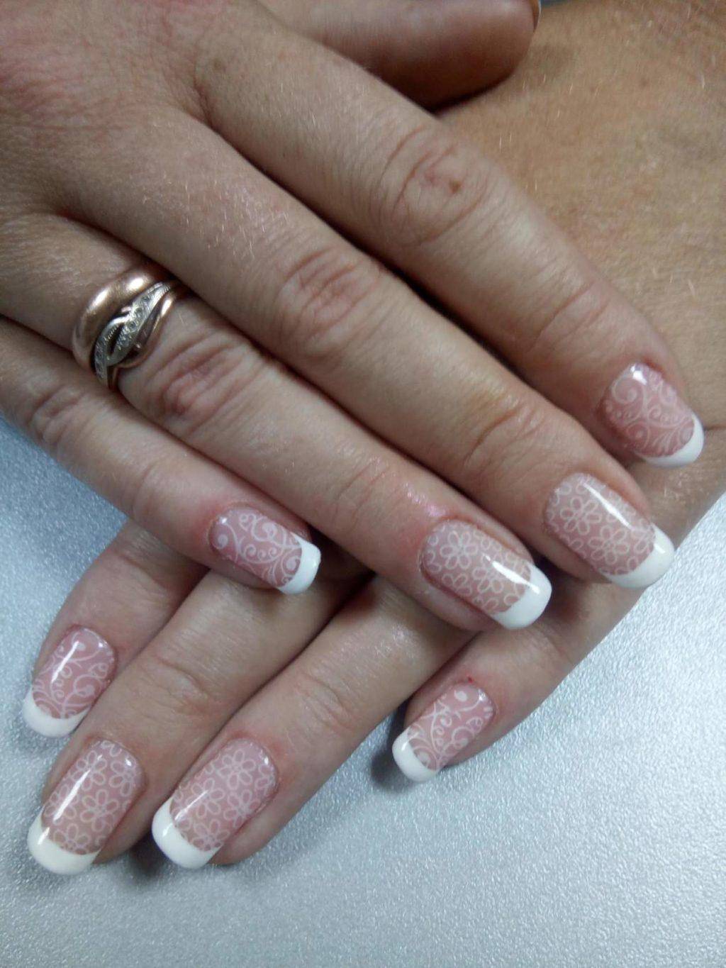 Чаще всего девушки для самого главного события в своей жизни выбирают маникюр с ажуром. В основном под такой вид, подходит французский маникюр, который отлично сочетается с белым, свадебным платьем.