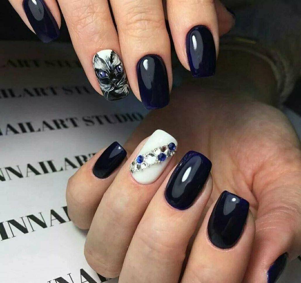 Стразы используются для декорирования однотонного черного, бордового, синего, белого маникюра. Расположить стразы можно несколькими способами: