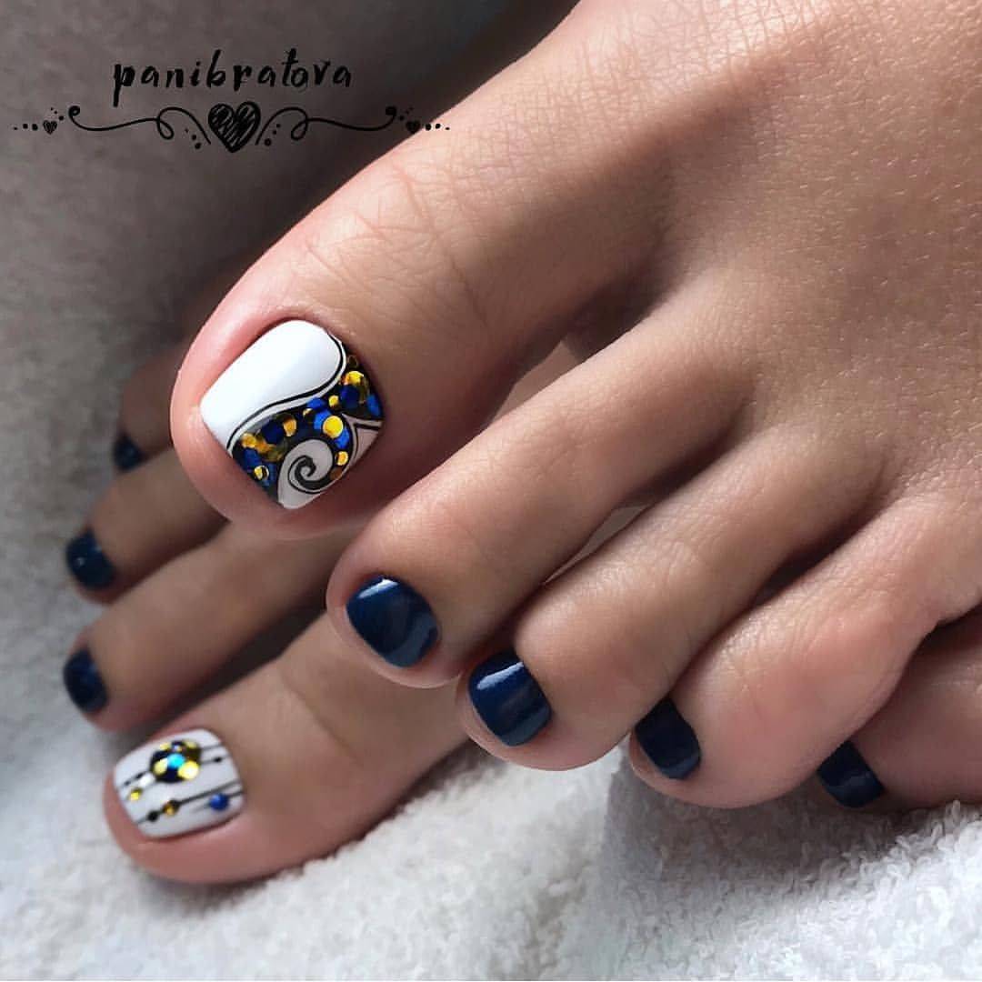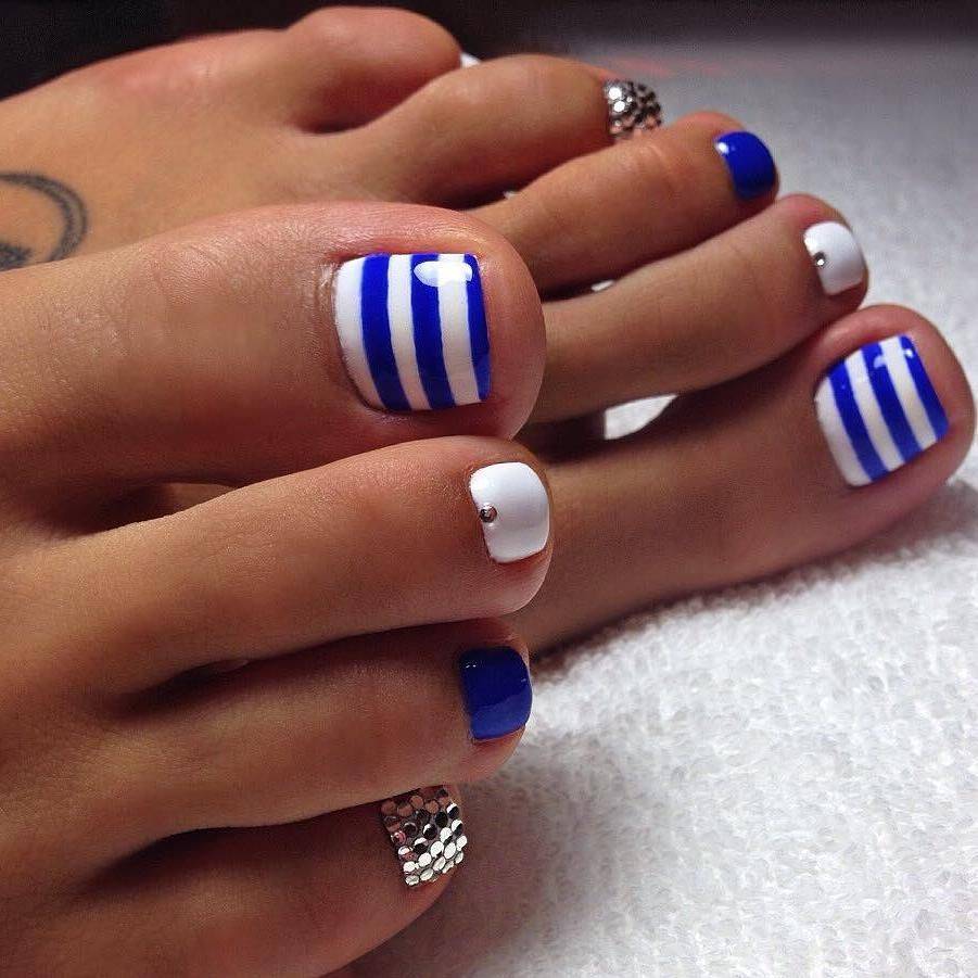 Для поклонниц абстракционизма и морских мотивов, желающих показать свою романтическую натуру, подойдет педикюр, включающий в себя сочетание синего и белого цвета. Данный цветовой дуэт привнесет прохладу в любой очень жаркий летний день.