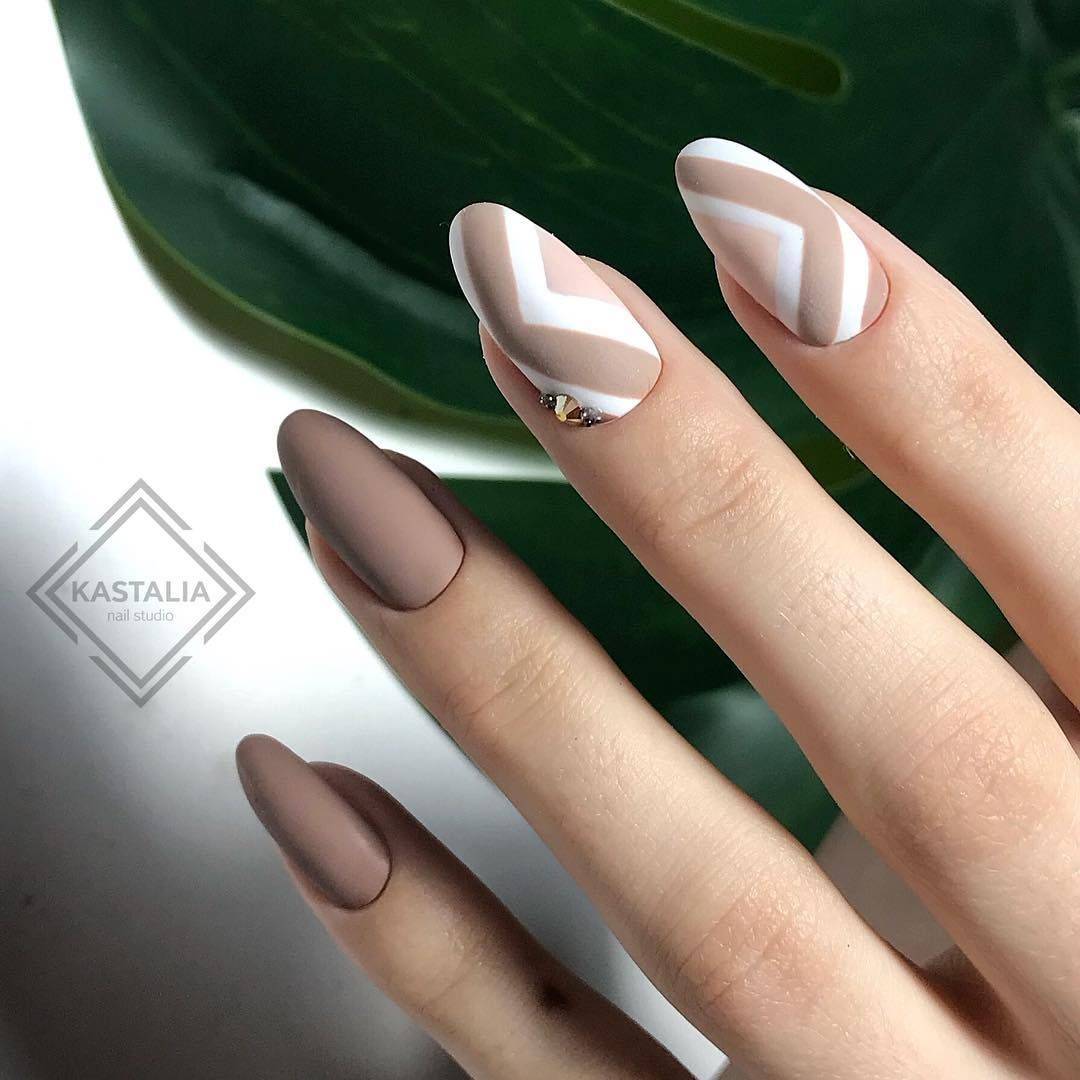 Матовое покрытие — идеальный вариант для бежевой палитры. Он хорошо смотрится как в однотонном дизайне, так и с различным оформлением. Интересным решением станет использование к матовой базе блесток или страз. Элементы декора можно разместить на самом бежевом покрытии либо сконцентрировать их на отдельных ногтевых пластинах. Также замечательно гармонируют матовые нюдовые оттенки с яркими и насыщенными лаками.