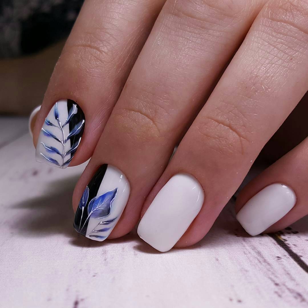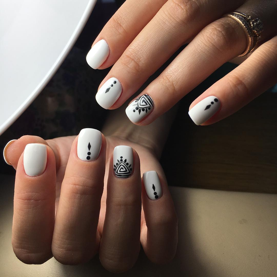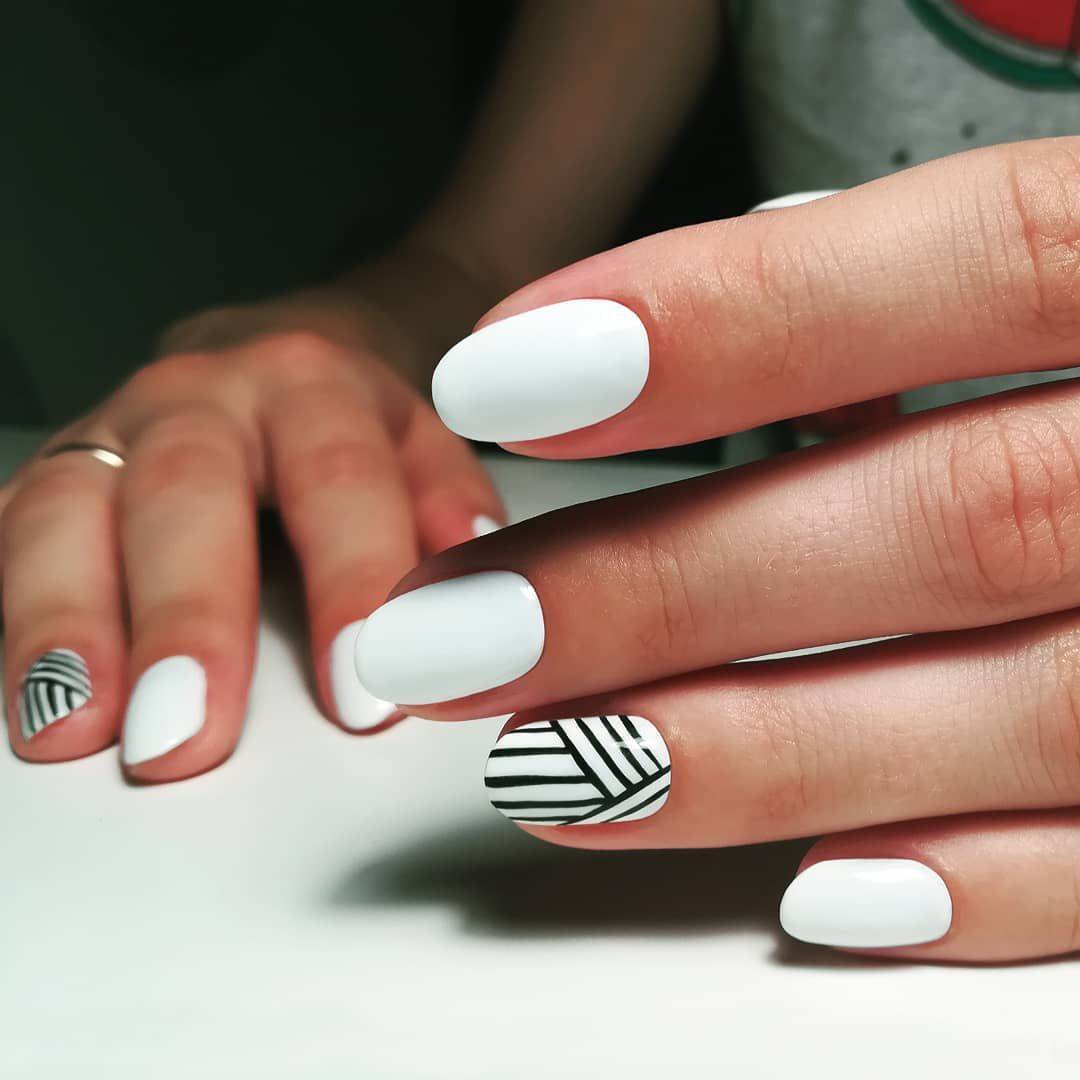 На белоснежную основу можно нанести полоски, а чтобы смотрелось ярче, можно дополнить цветочные слайдеры. Кроме того, к сочетанию черно-белых красок подойдет дополнение из других тонов, таких как ярко-розовый или желтый.