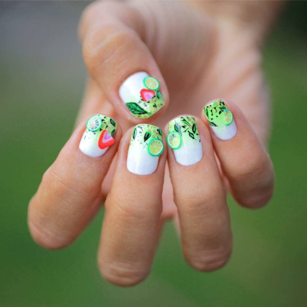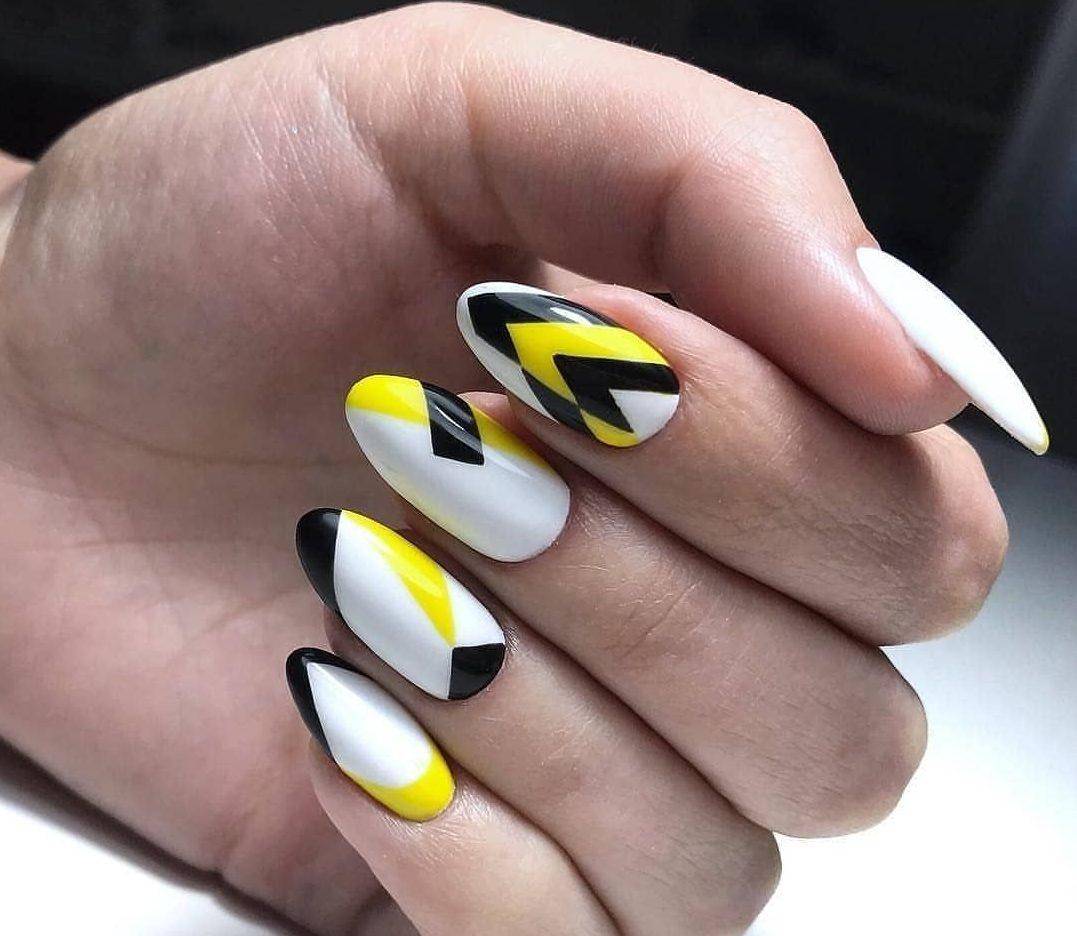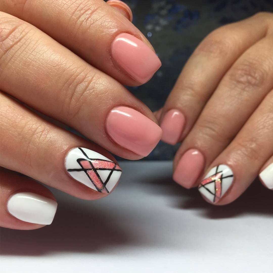 На белоснежную основу можно нанести полоски, а чтобы смотрелось ярче, можно дополнить цветочные слайдеры. Кроме того, к сочетанию черно-белых красок подойдет дополнение из других тонов, таких как ярко-розовый или желтый.