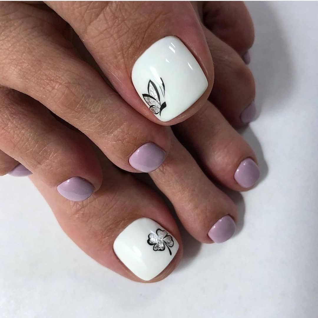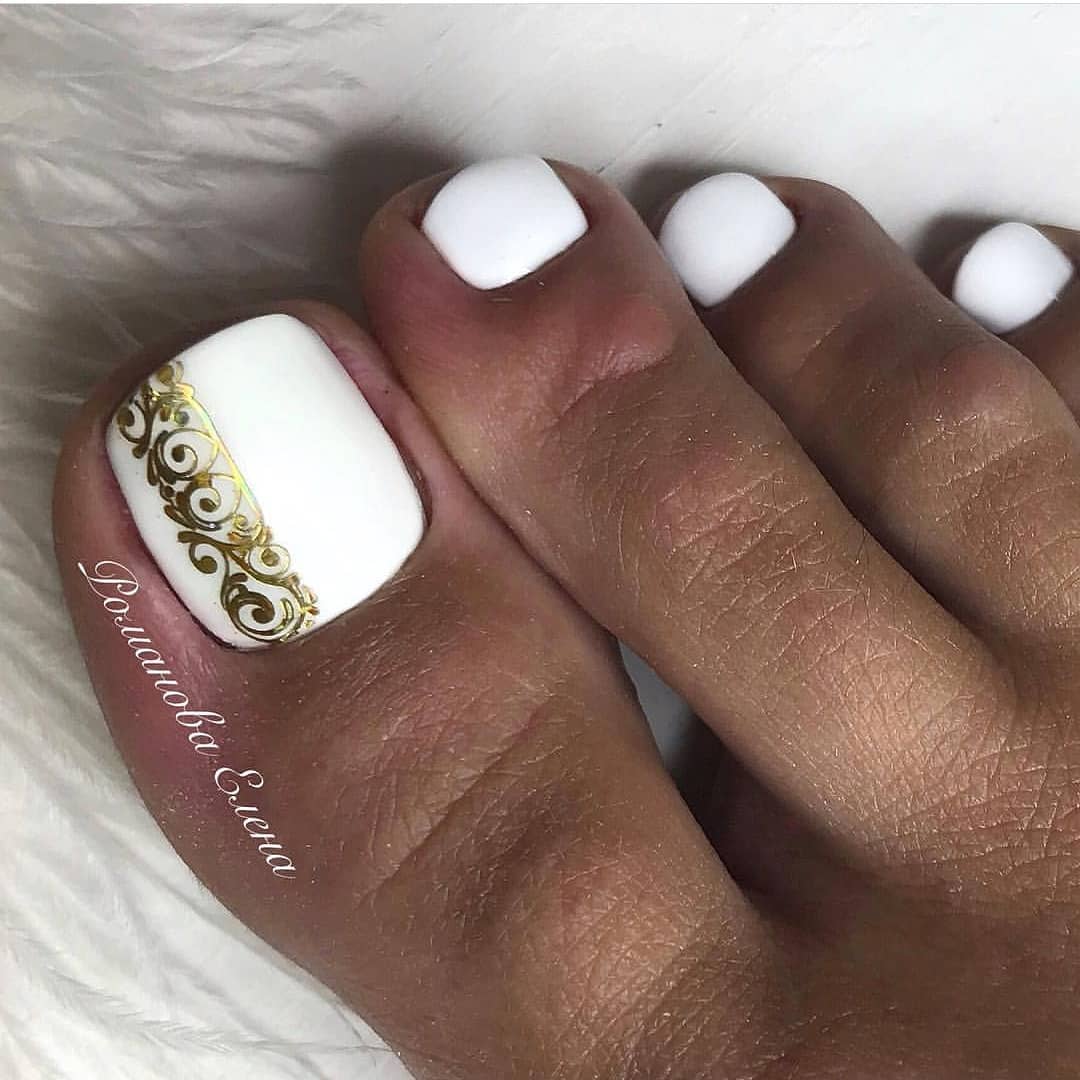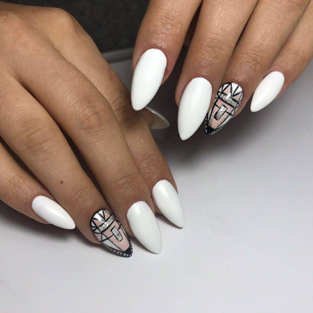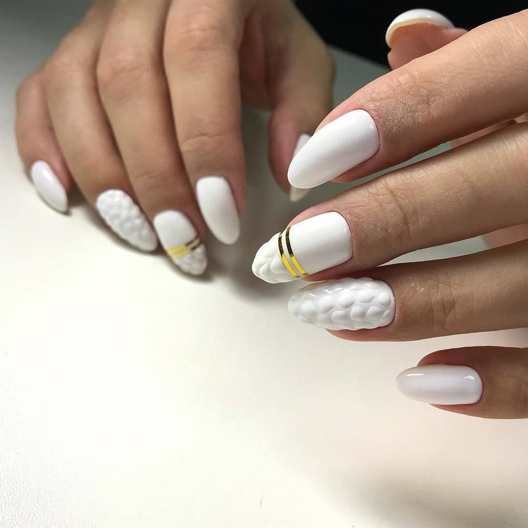 Если идеальной формы все-таки добиться не удается, а хочется, как на эффектном фото белого педикюра, выкрасить ногти в этот яркий цвет, то можно совместить его с какими-либо другими оттенками и узорами, отвлекающими внимание от основной формы ногтя