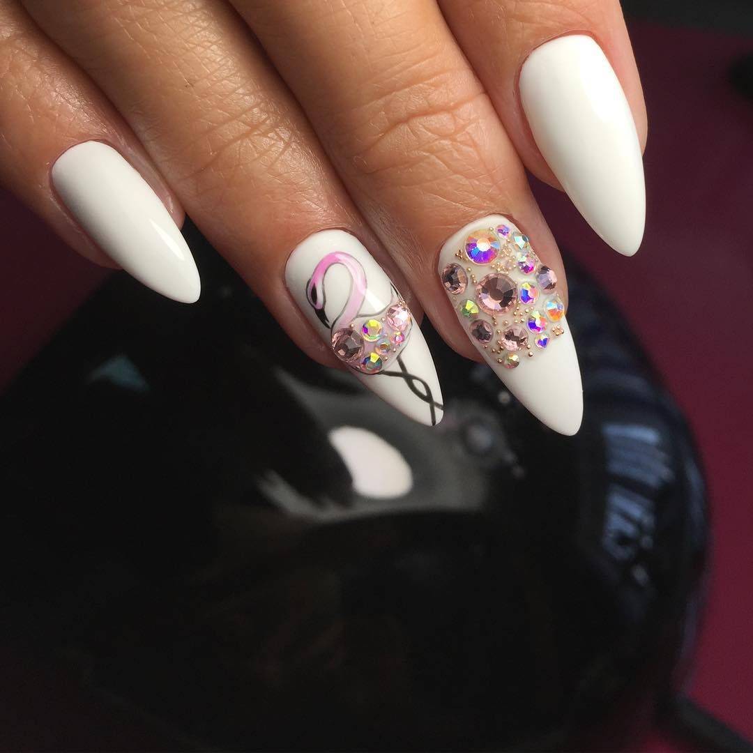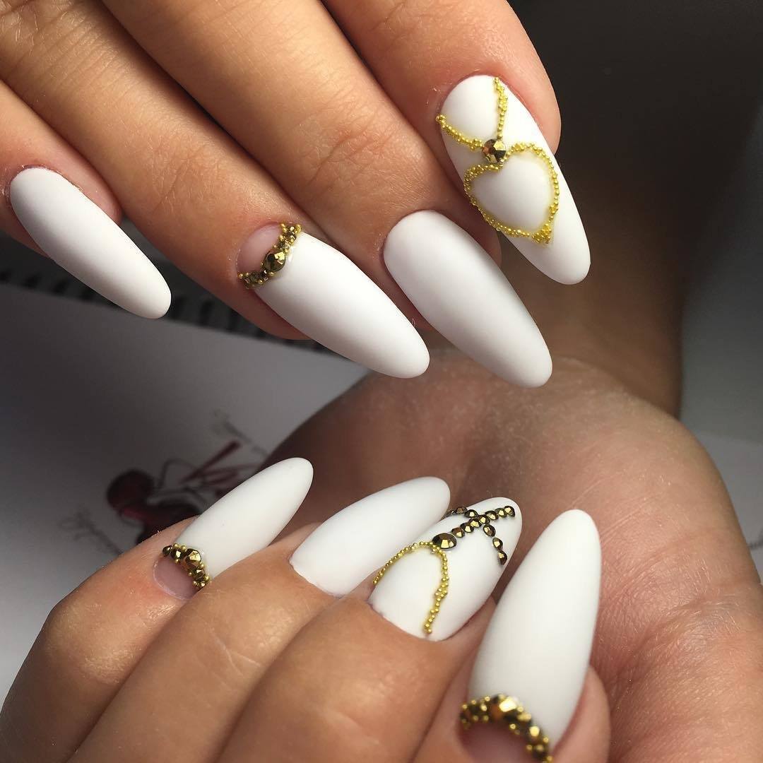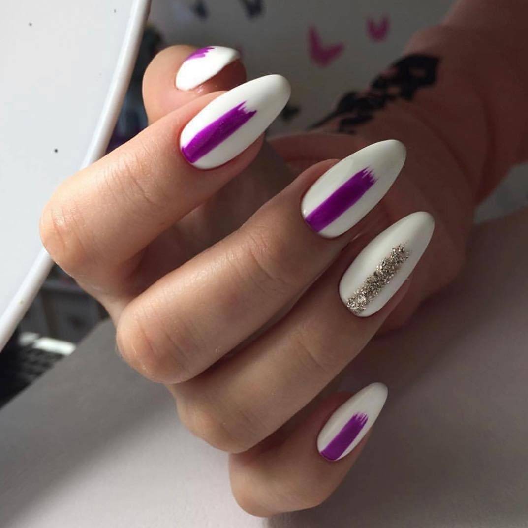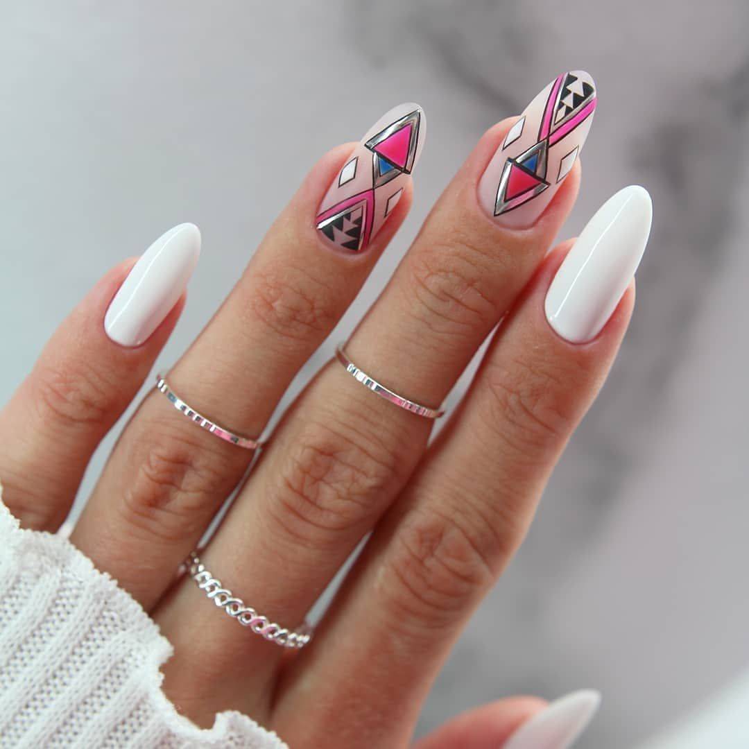 Если идеальной формы все-таки добиться не удается, а хочется, как на эффектном фото белого педикюра, выкрасить ногти в этот яркий цвет, то можно совместить его с какими-либо другими оттенками и узорами, отвлекающими внимание от основной формы ногтя