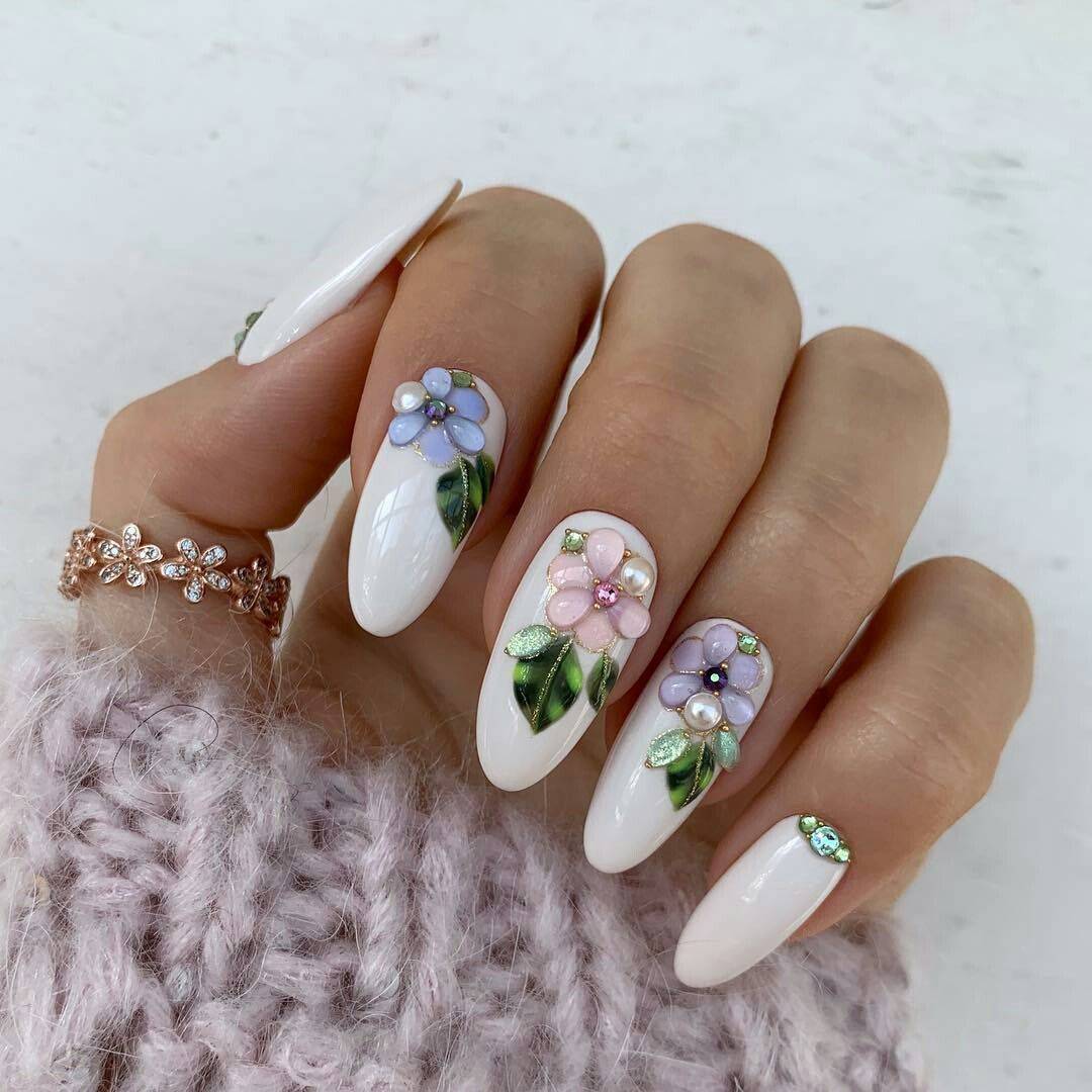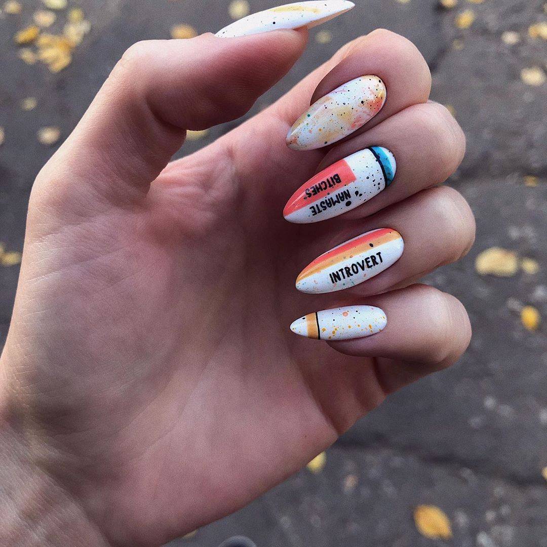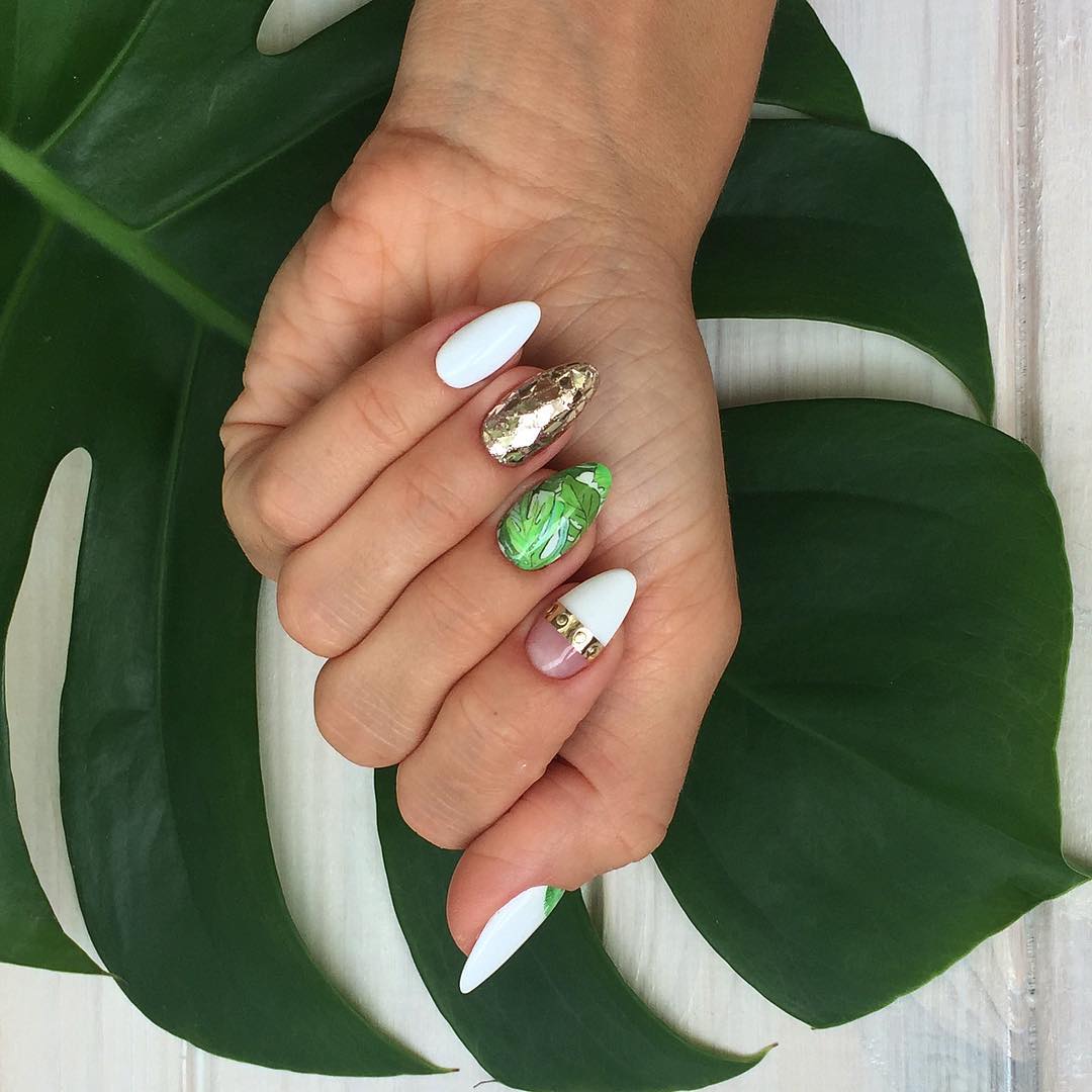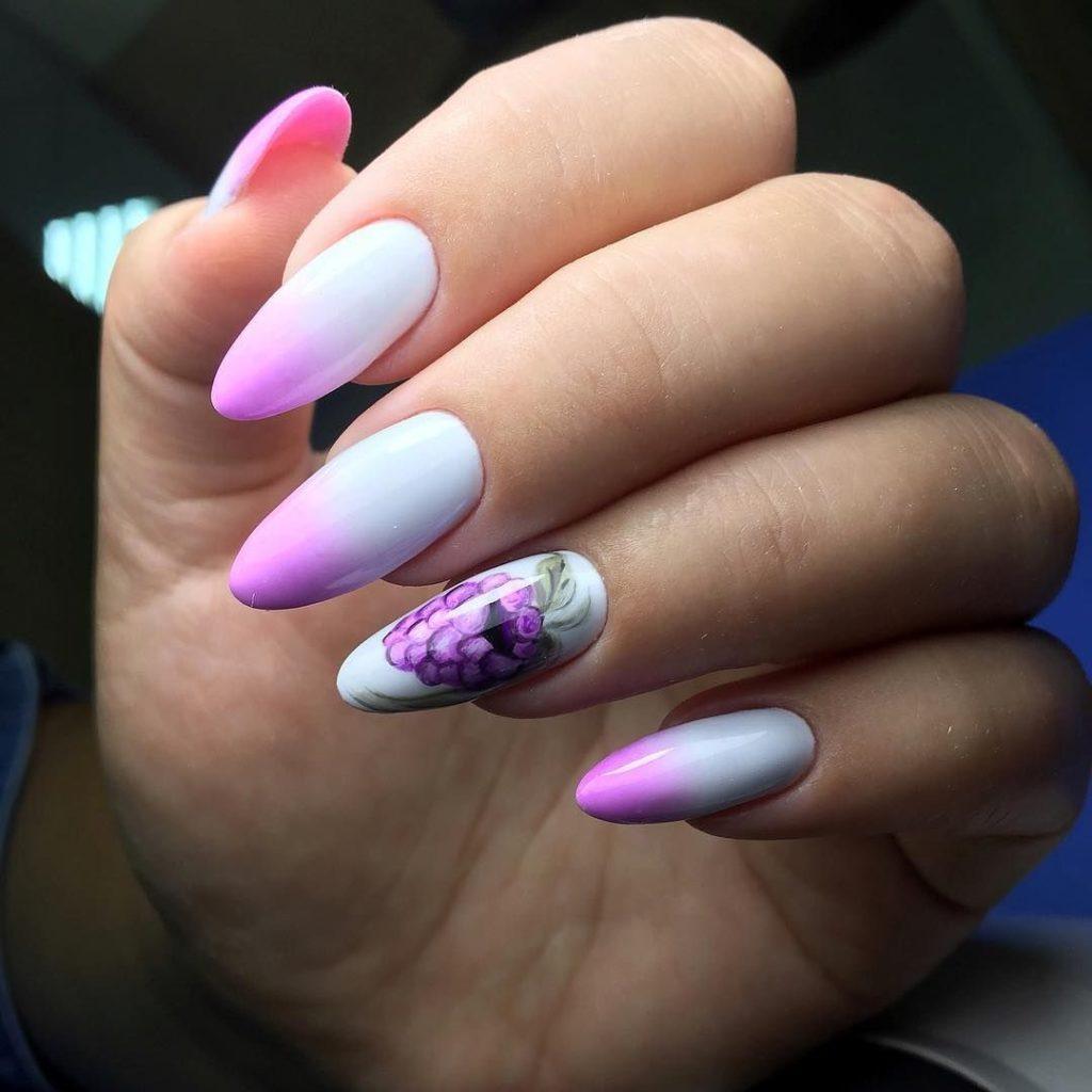 Если идеальной формы все-таки добиться не удается, а хочется, как на эффектном фото белого педикюра, выкрасить ногти в этот яркий цвет, то можно совместить его с какими-либо другими оттенками и узорами, отвлекающими внимание от основной формы ногтя