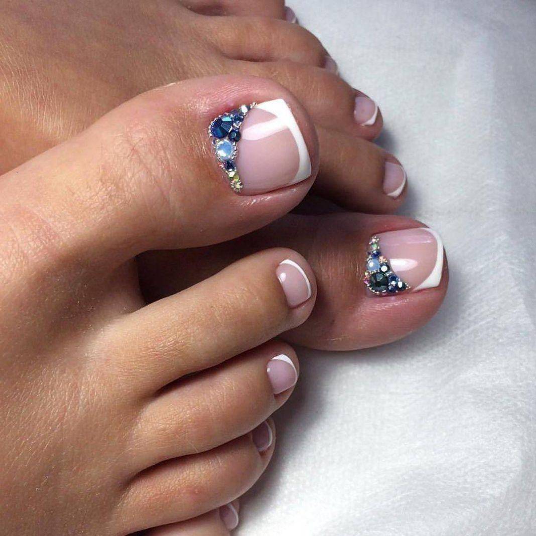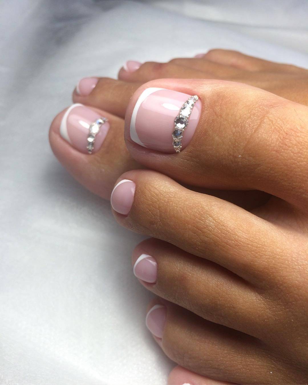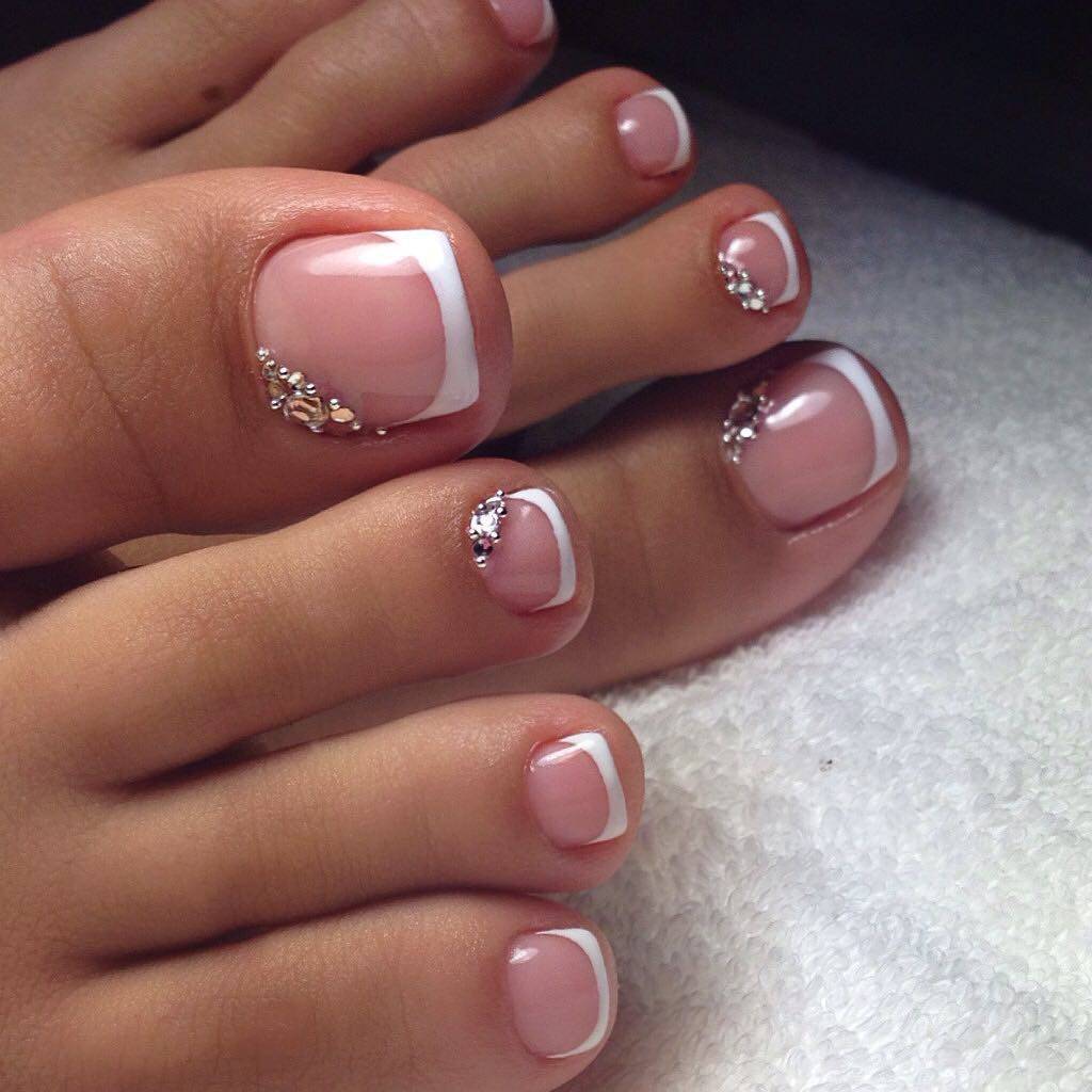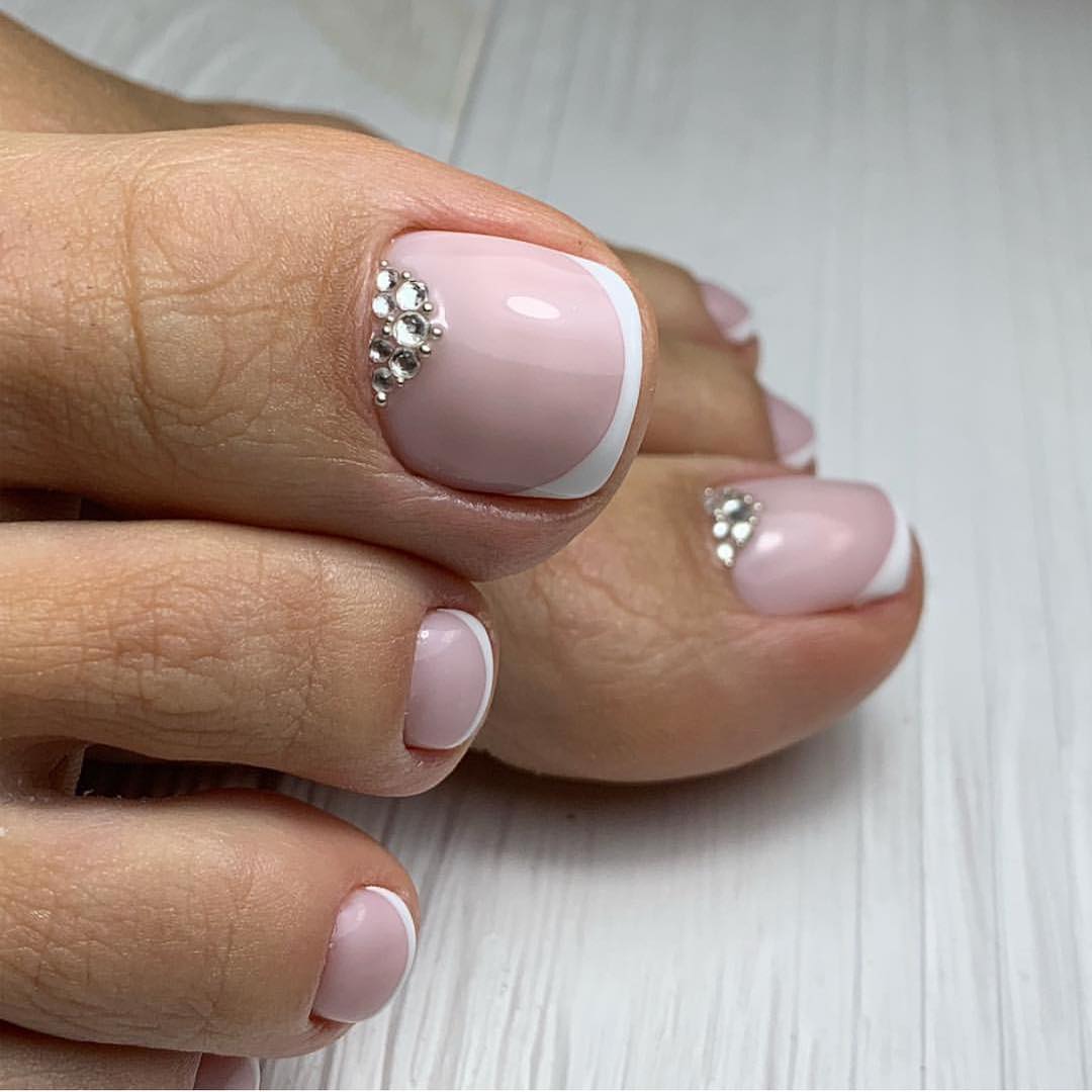 Французский дизайн — на фоне нюдовых тонов получается легким и нежным. Особенно естественно выглядит использование классического френча без постороннего оформления. Для желающих разнообразить простой дизайн можно использовать стразы или блестки. Также всегда выигрышно смотрится сочетание французского и лунного педикюра.