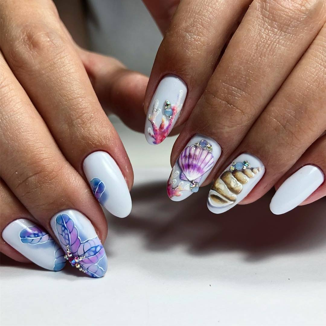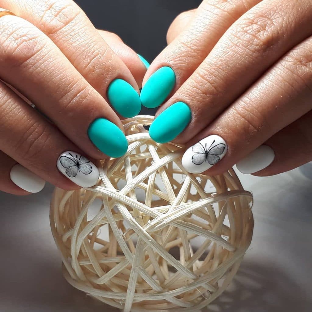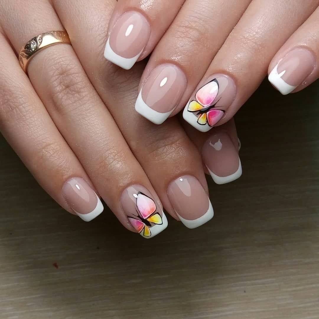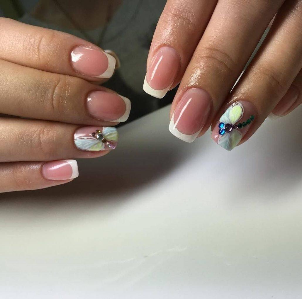 Ну и конечно же, летом особенно актуальным становится рисунок в виде бабочек. Пышные крылья в разных оттенках смотрятся невероятно красиво. Тем более, что их достаточно часто украшают небольшим количеством блесток или страз. Это делает маникюр более заметным и эффектным.