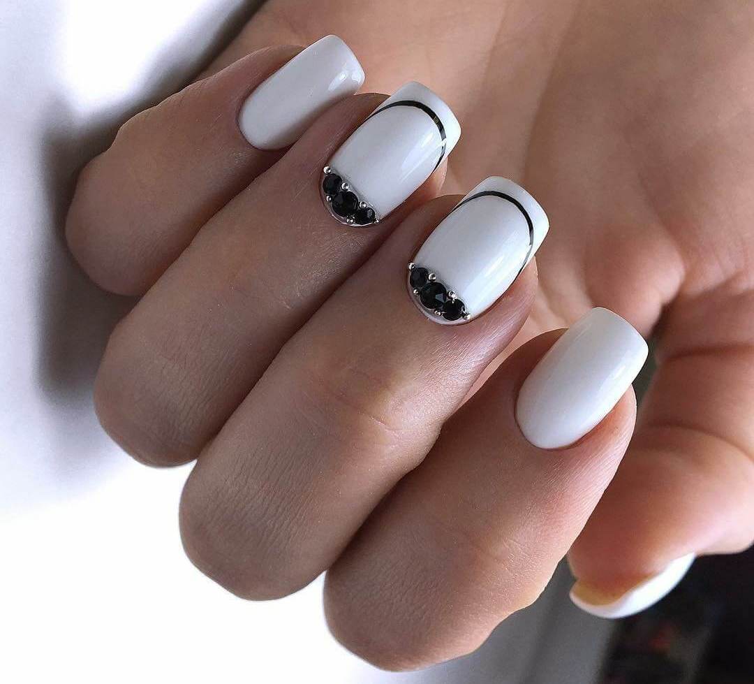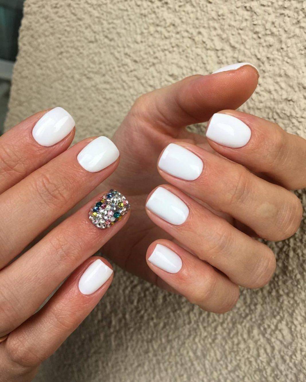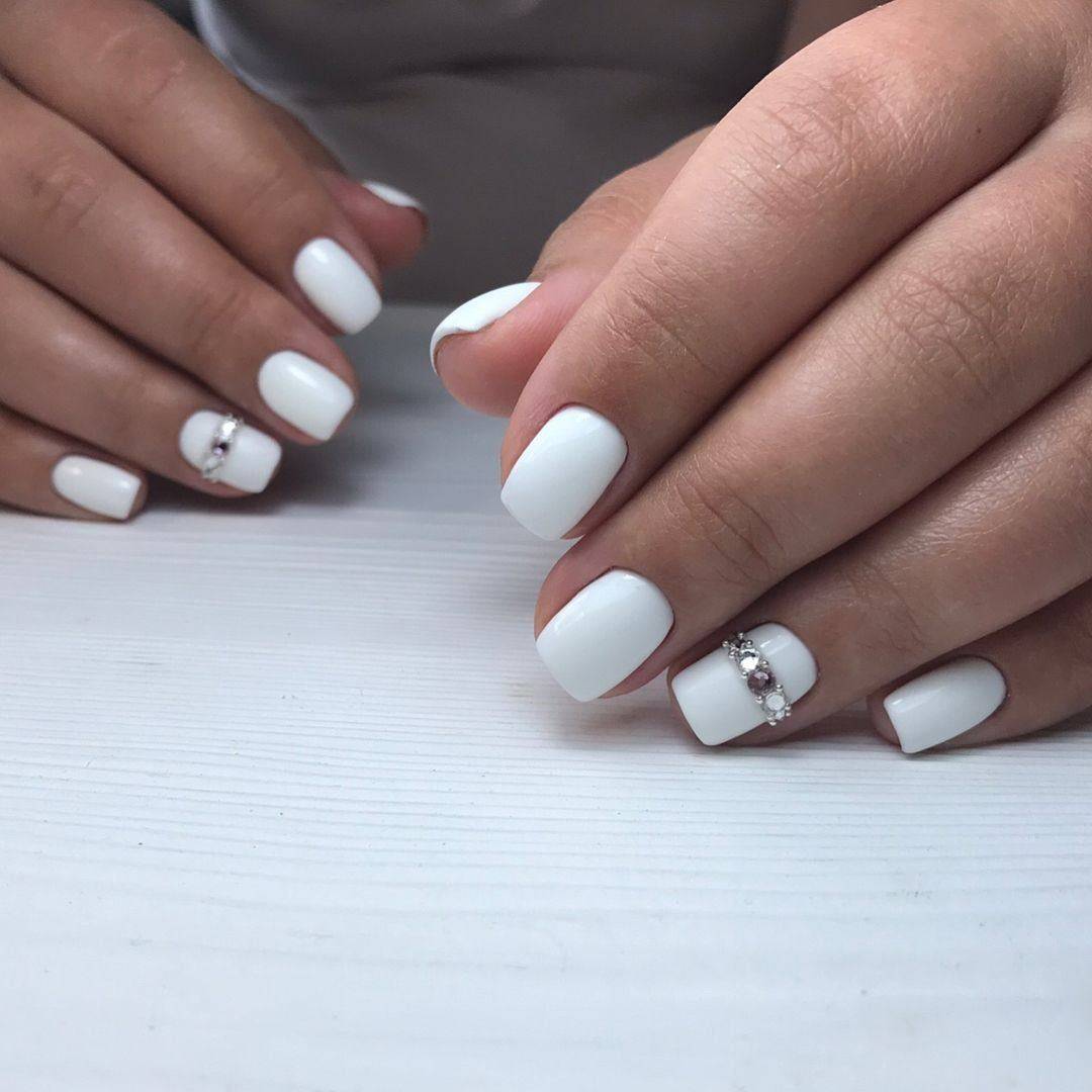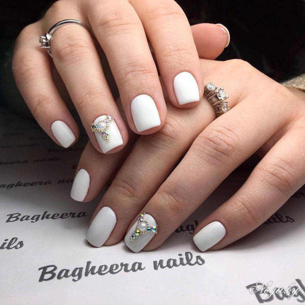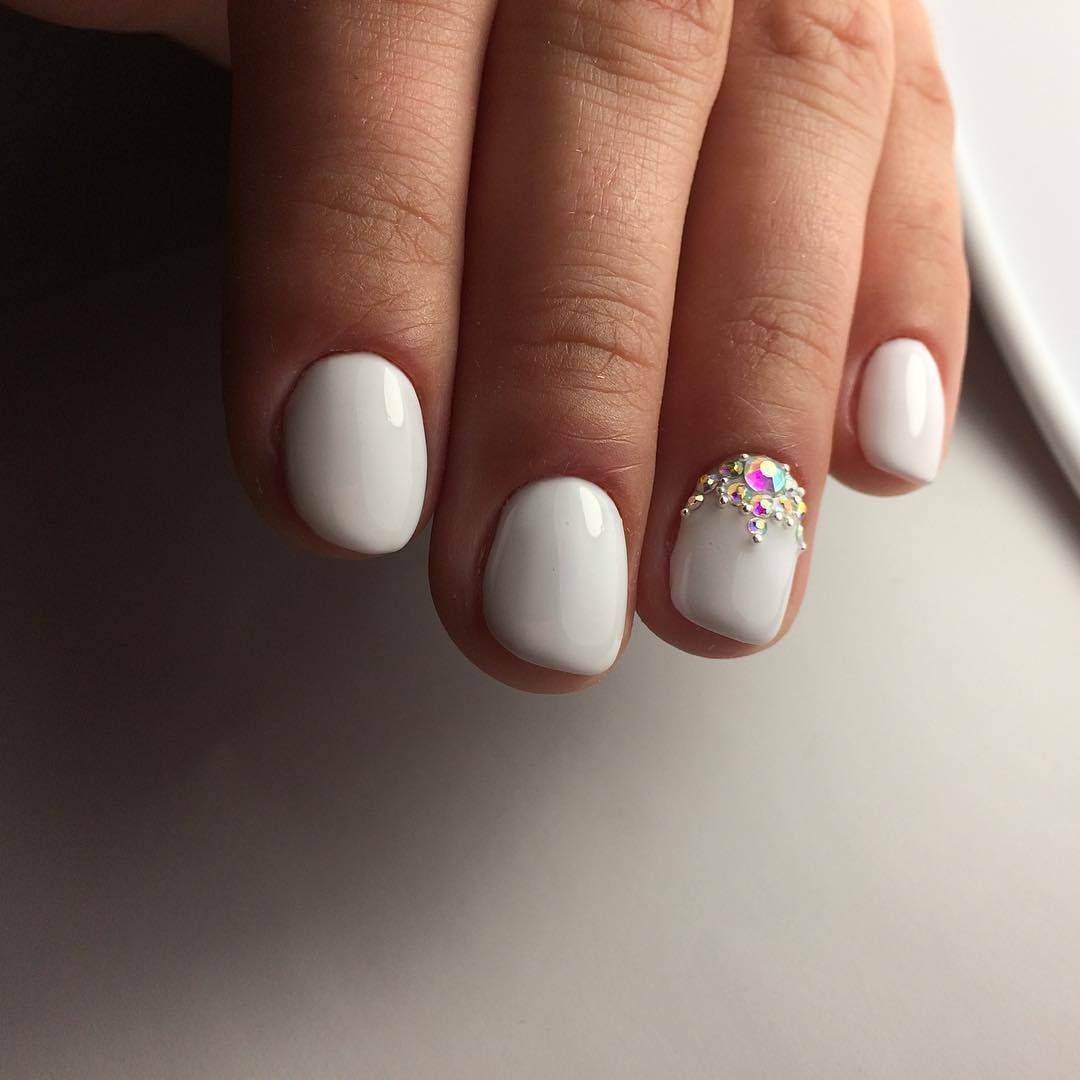 Однотонный маникюр практически не нуждается в декоре, особенно если речь идет о белом цвете. Но вы всегда можете дополнить маникюр стразами или бульонками в прикорневой зоне, серебряным глиттером.