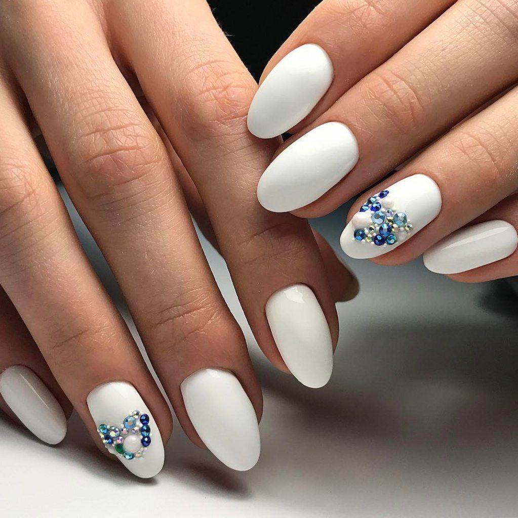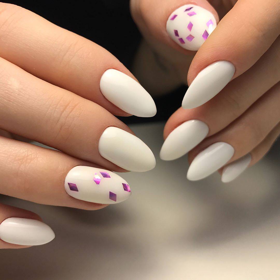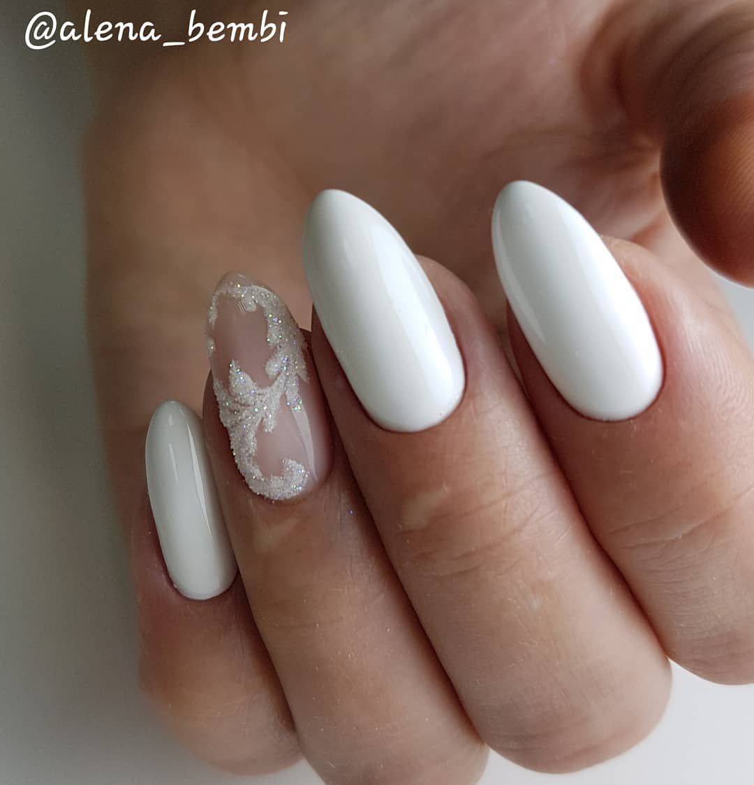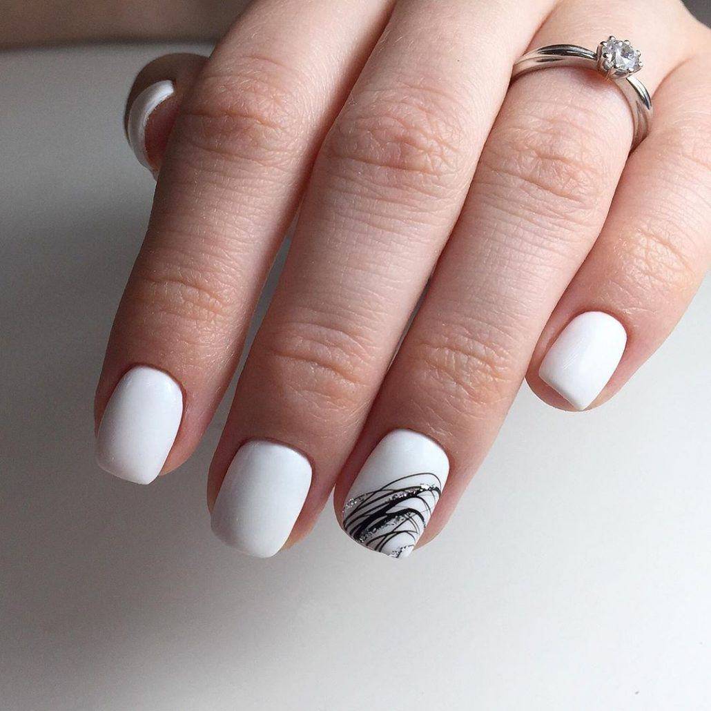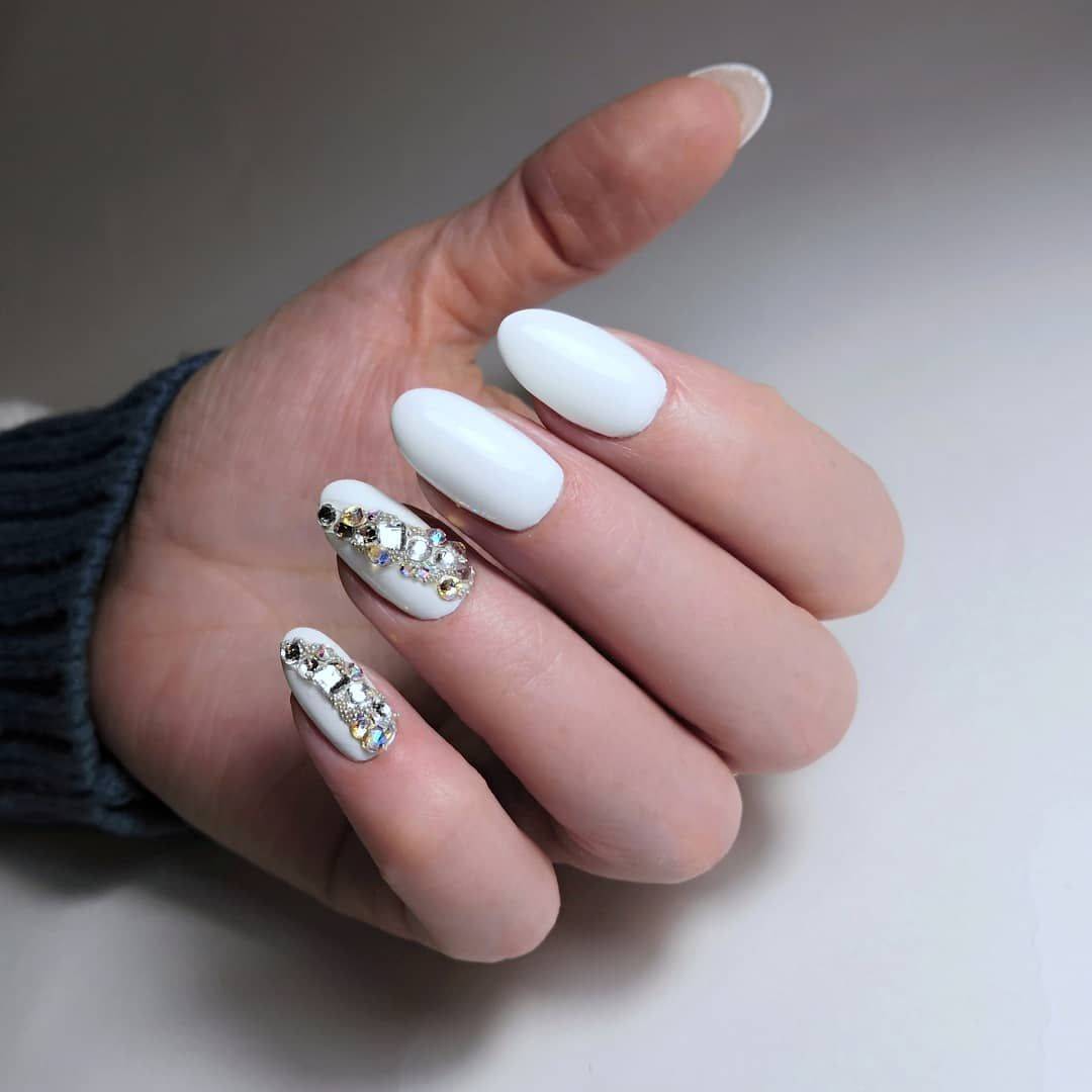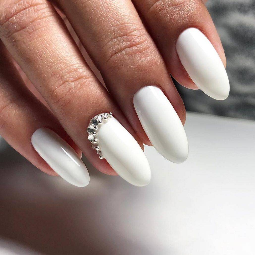 Однотонный маникюр практически не нуждается в декоре, особенно если речь идет о белом цвете. Но вы всегда можете дополнить маникюр стразами или бульонками в прикорневой зоне, серебряным глиттером.