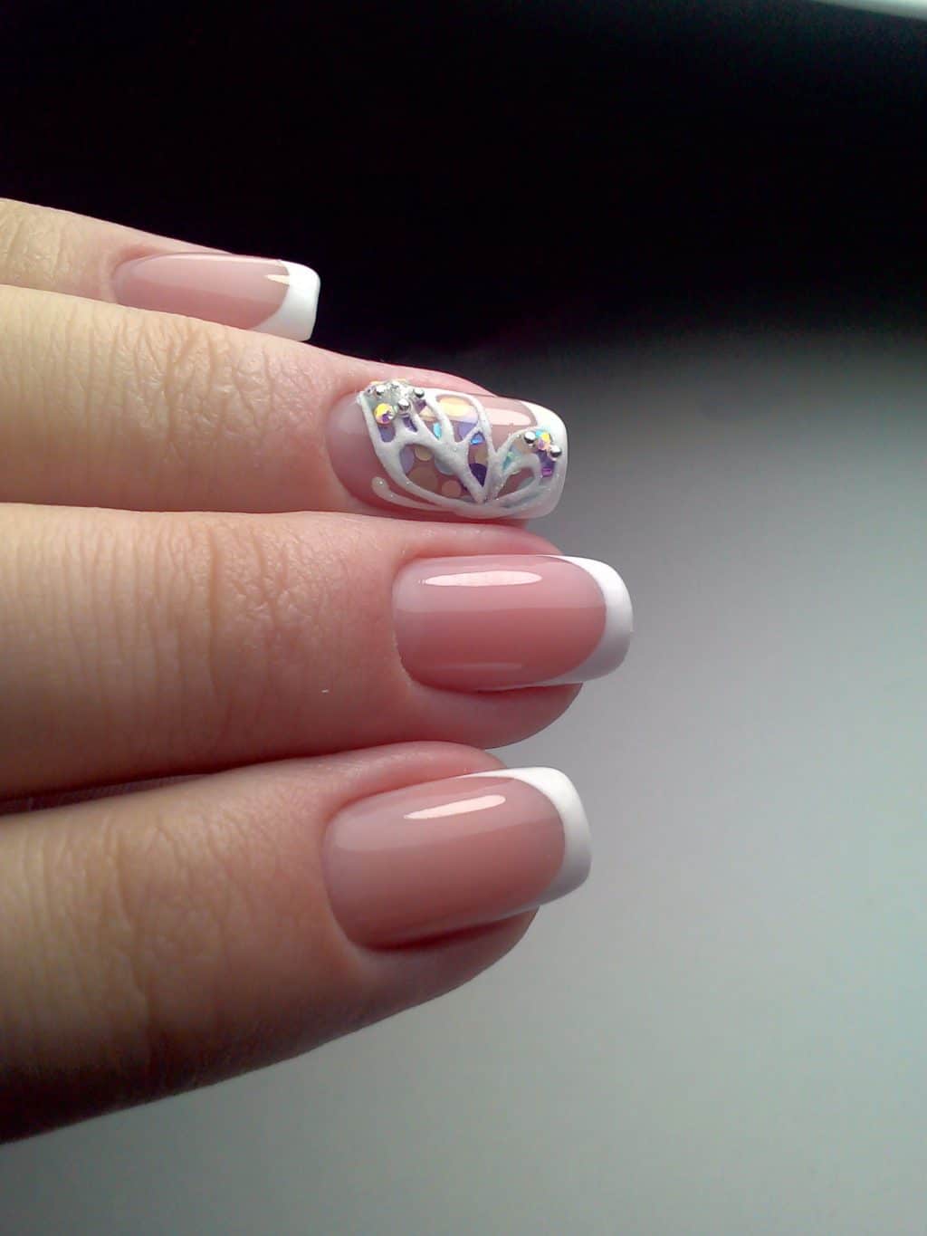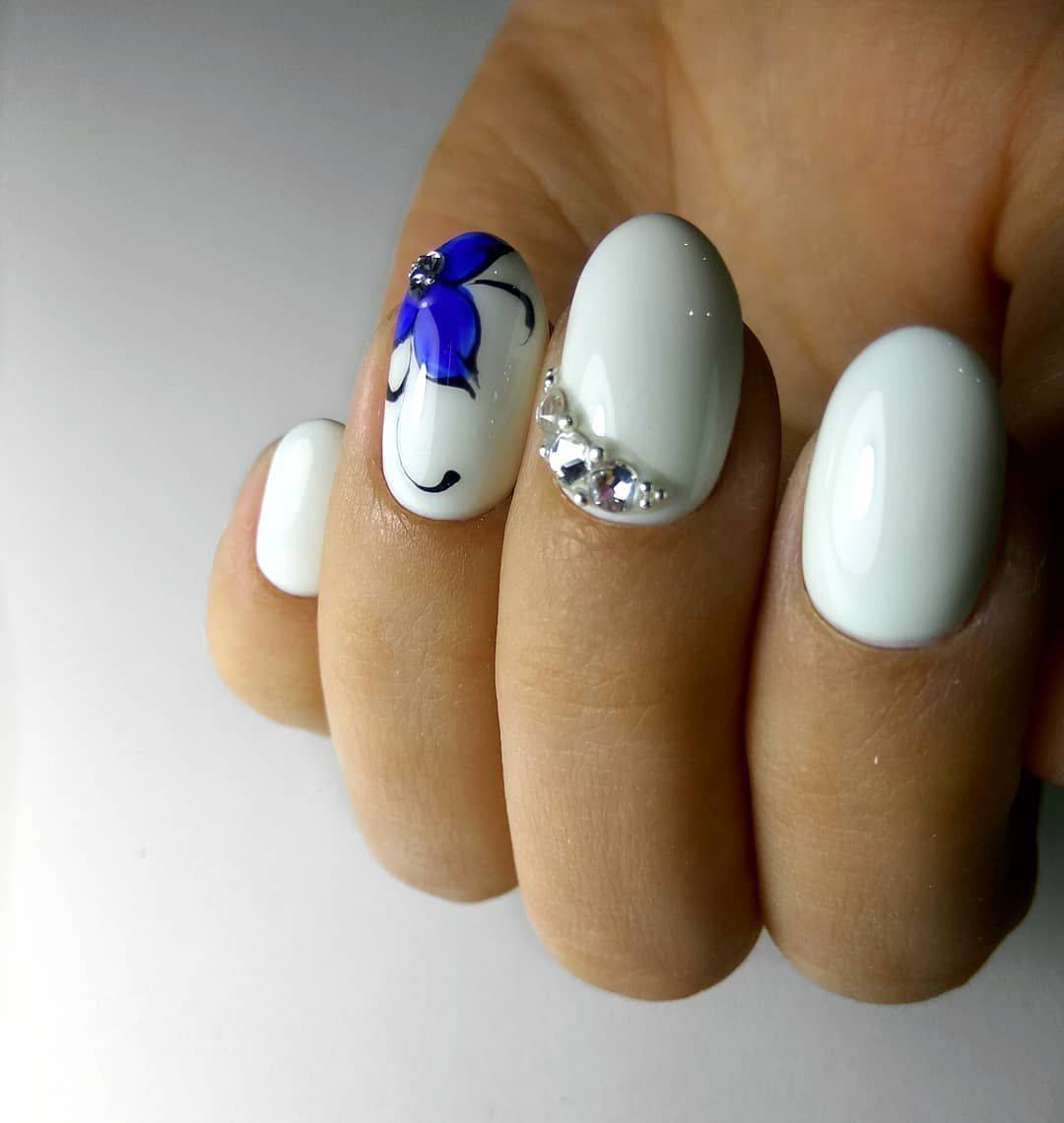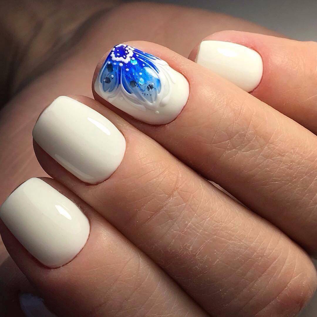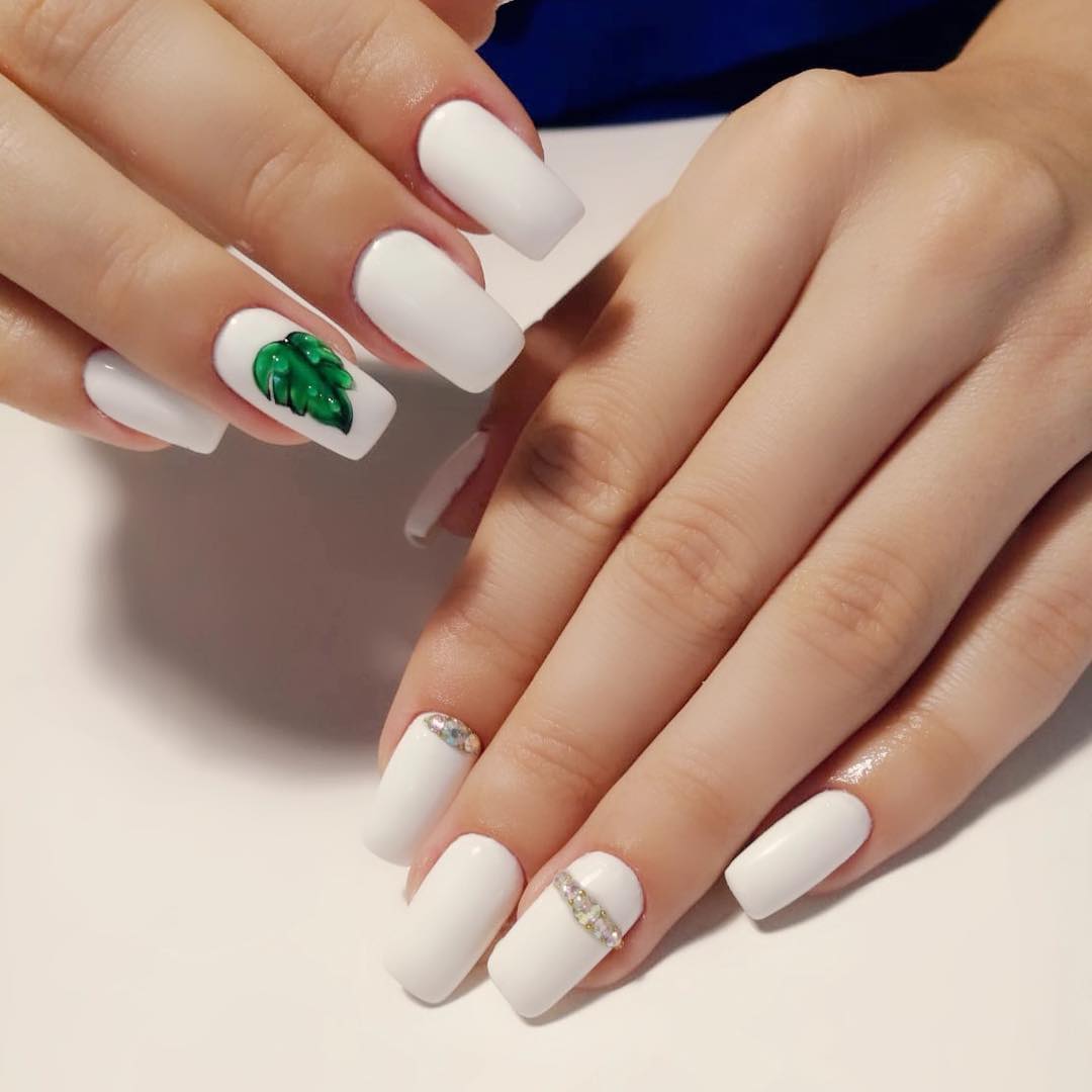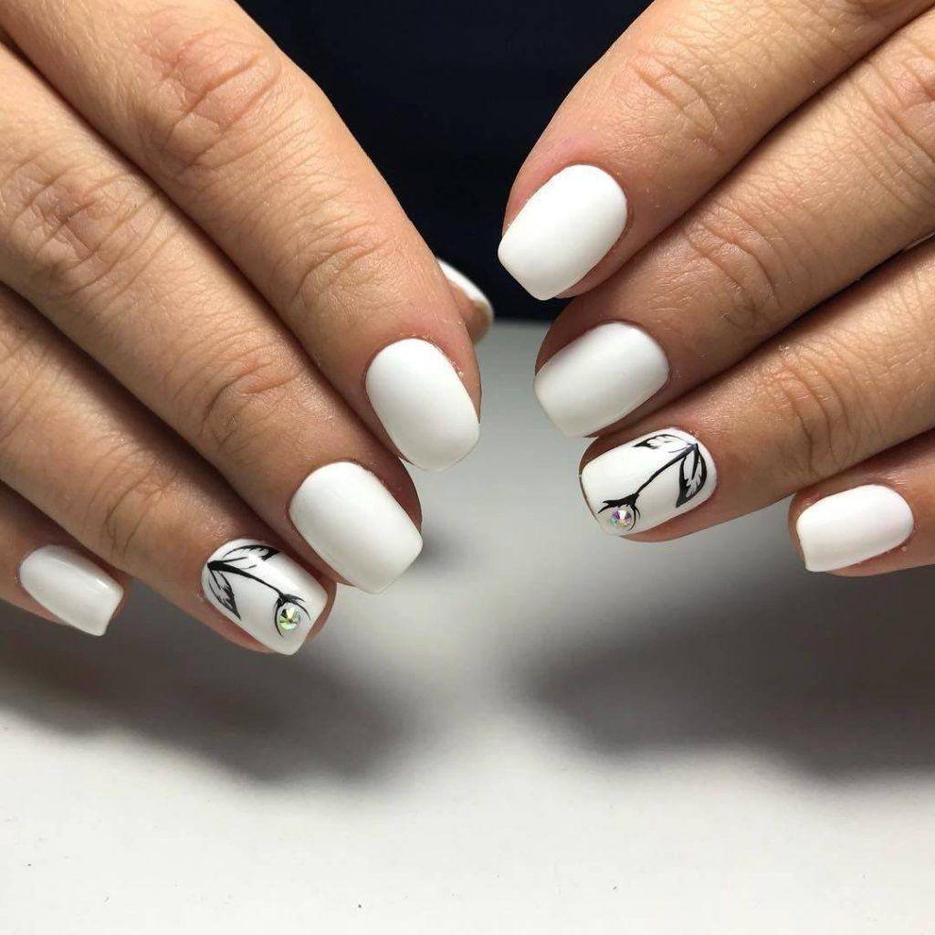 Однотонный маникюр практически не нуждается в декоре, особенно если речь идет о белом цвете. Но вы всегда можете дополнить маникюр стразами или бульонками в прикорневой зоне, серебряным глиттером.