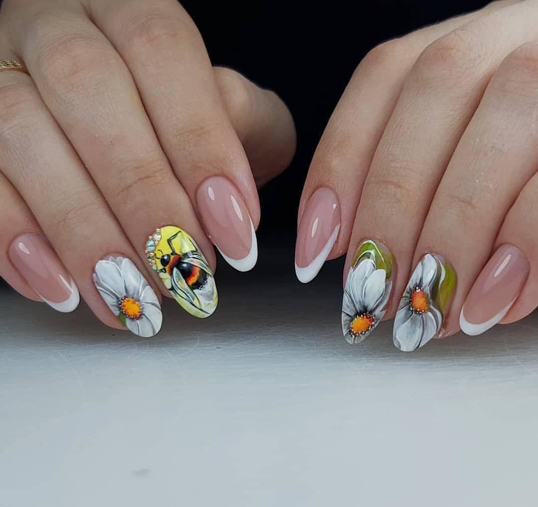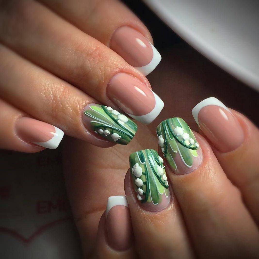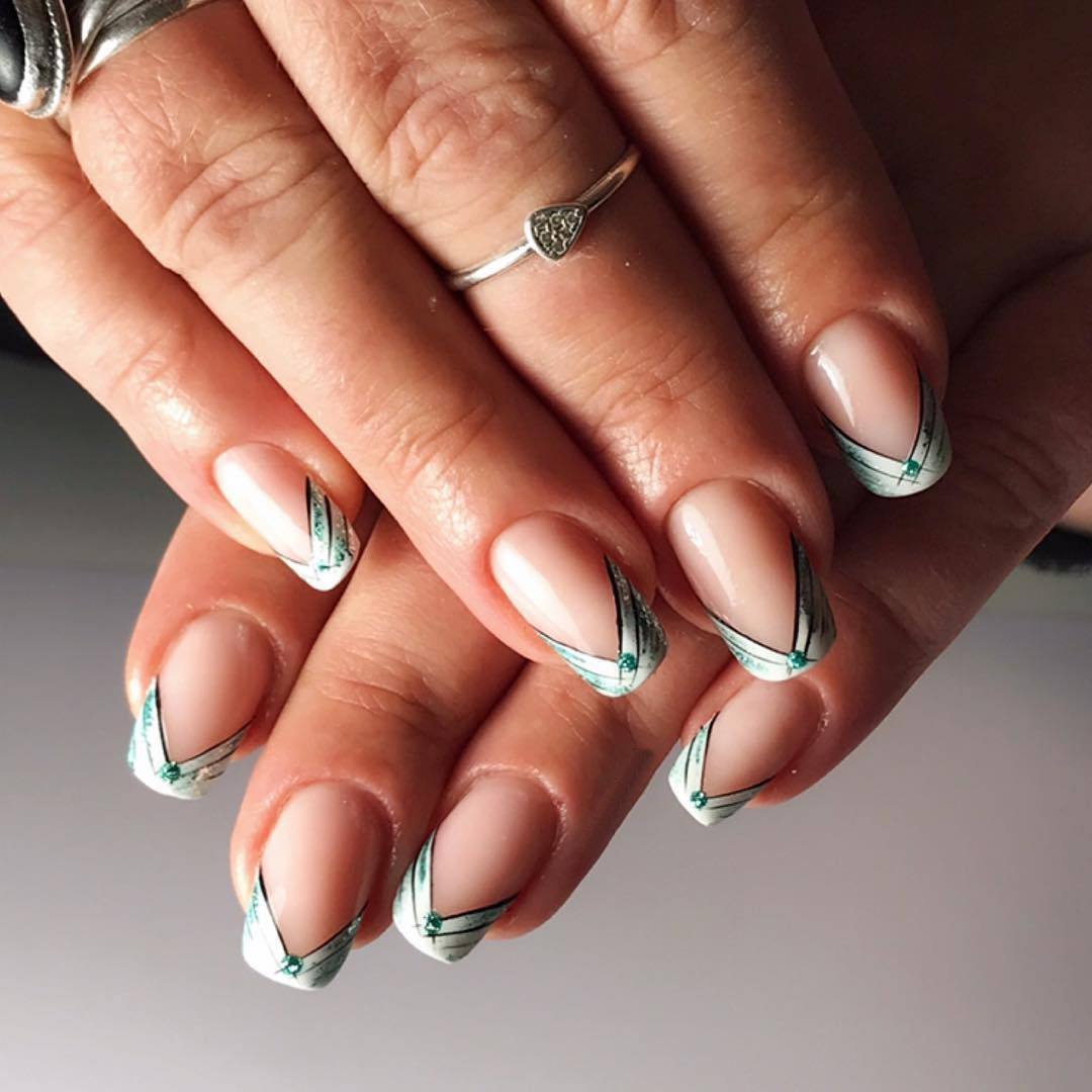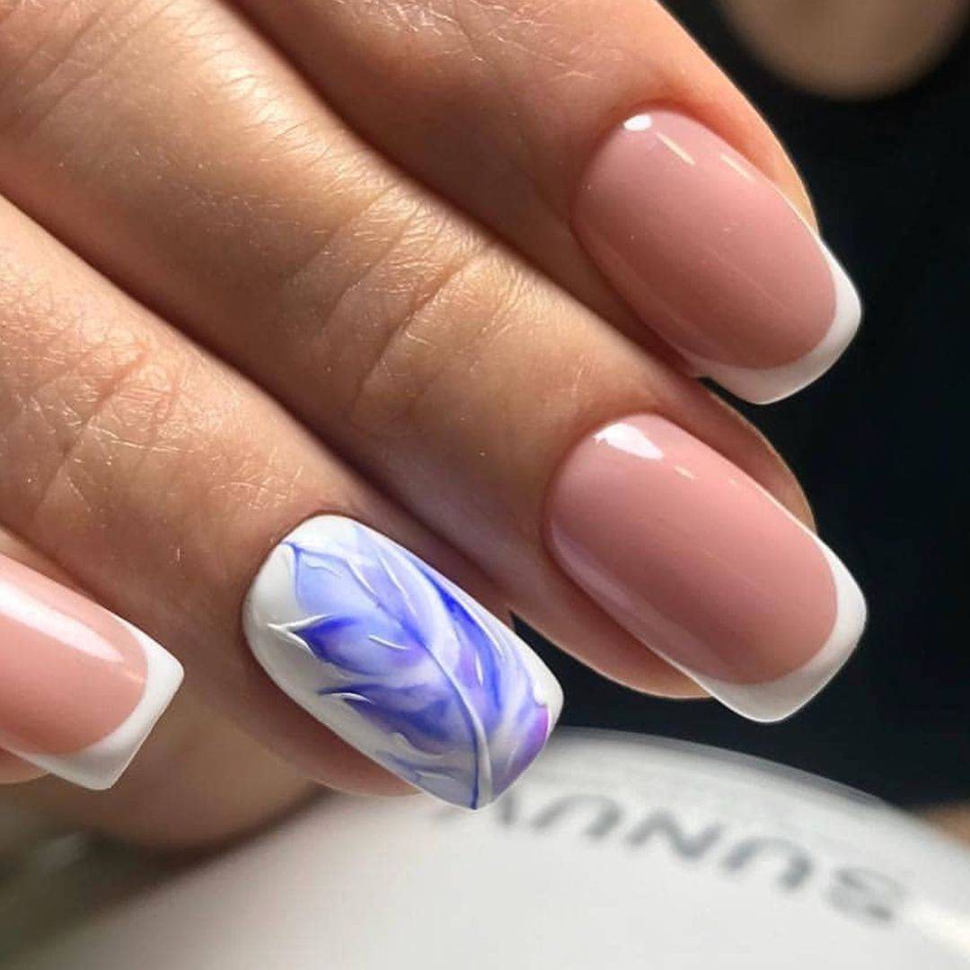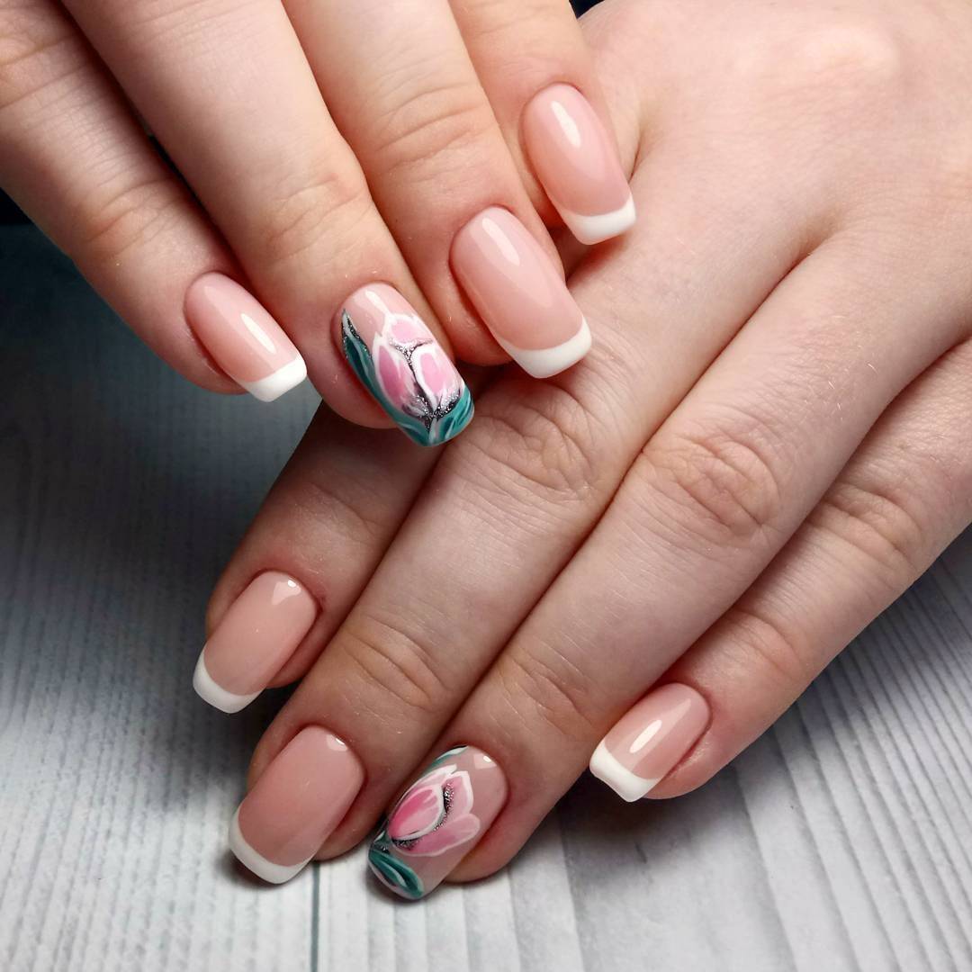 Сделать маникюр и педикюр френч более оригинальным поможет прорисованные цветы на одном или нескольких ногтях, геометрические узоры, абстрактные и этнические рисунки.