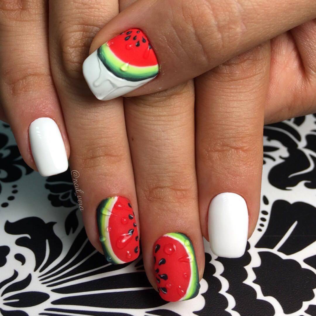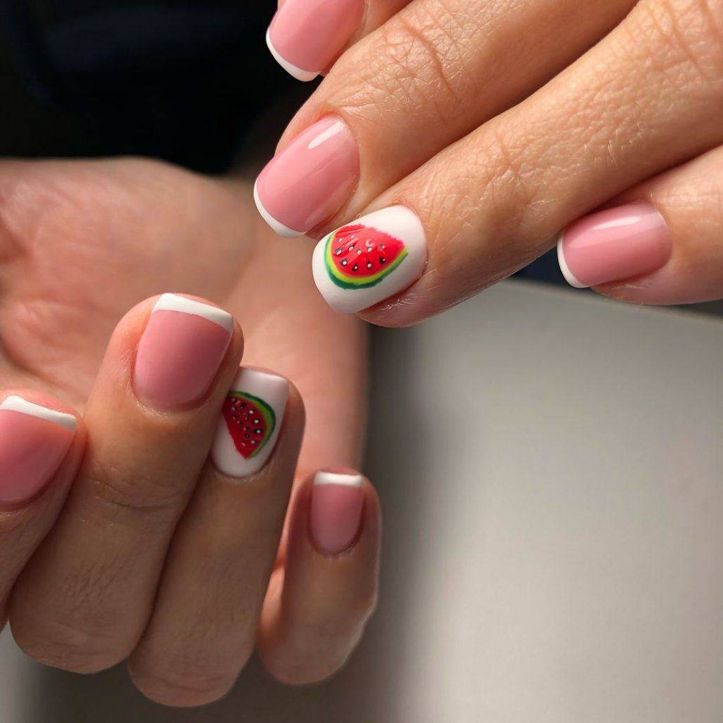 Насыщенный красный, синий, терракотовый, оранжевый, зелёный, малиновый или лимонный, а также золотистый или серебристый лак в этом случае как раз то, на что стоит обратить внимание. Оригинальные рисунки на летнюю тематику в виде фруктов, ягод, морских пейзажей или красочной флористики сделают яркий тандем маникюра-педикюра лишь более привлекательным