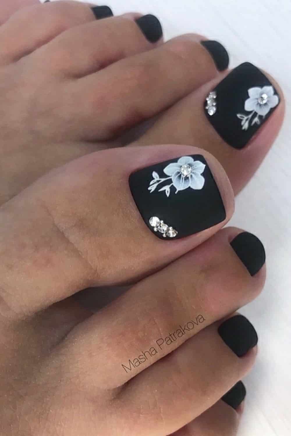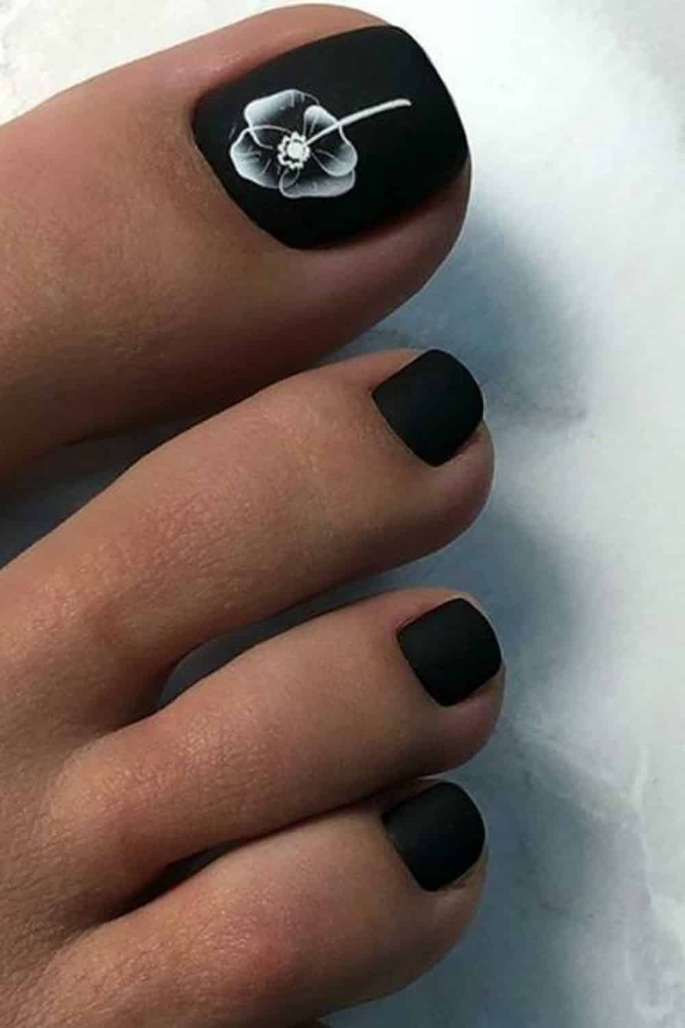 Восхитительно смотрится педикюр с матовым лаком, когда на черном фоне появляется небольшой изящный белый принт.
