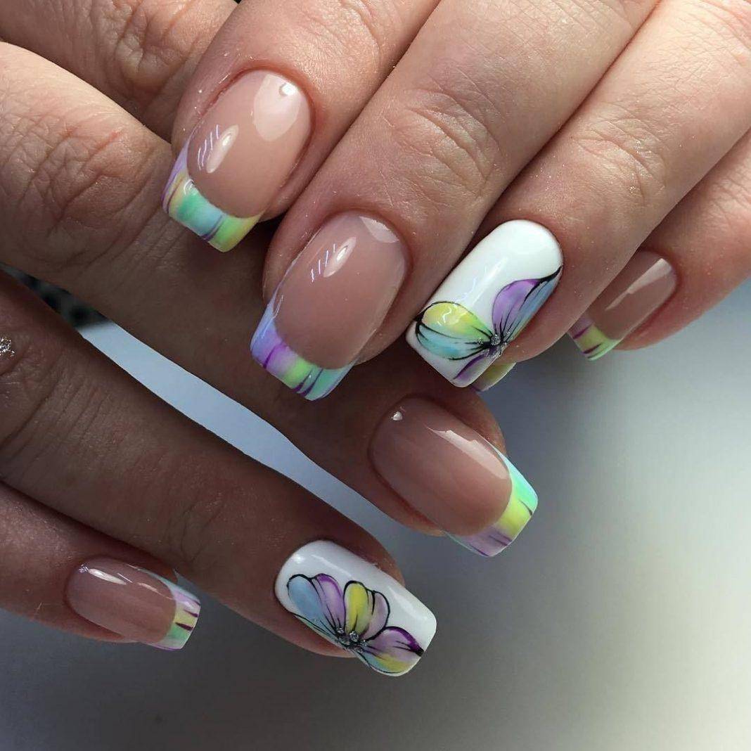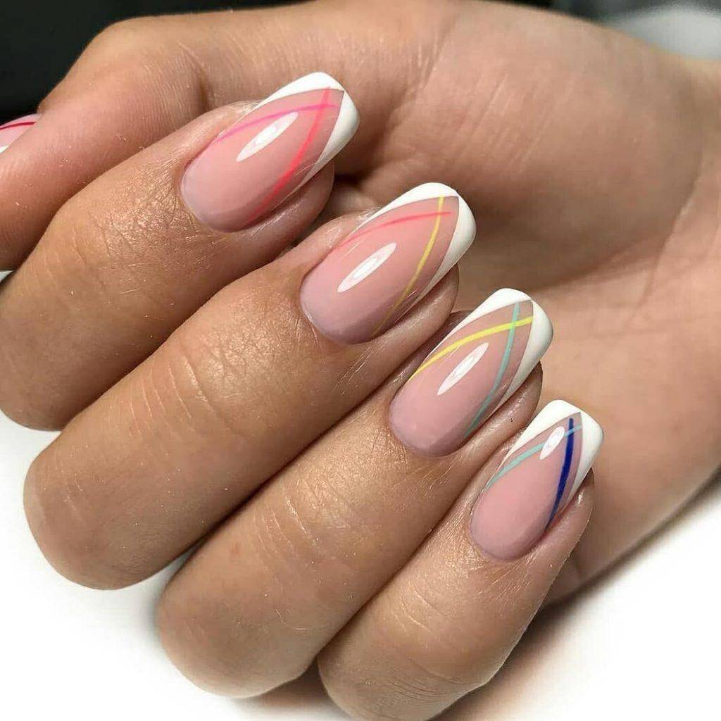 Если такой дизайн кажется вам слишком банальным, то сделайте кончики на руках и ногах разным цветом. Замените стандартные белые края на разноцветные: красный, синий, розовый, фиолетовый, зеленый. Интересно смотрится радужный френч, где в прорисовке «улыбки» участвуют сразу несколько ярких оттенков.