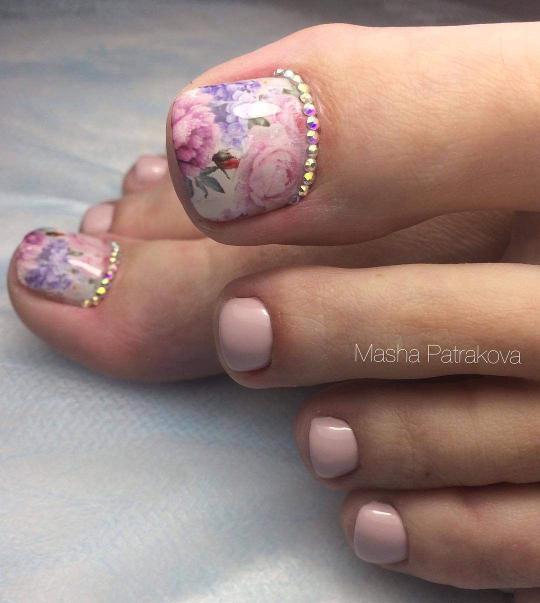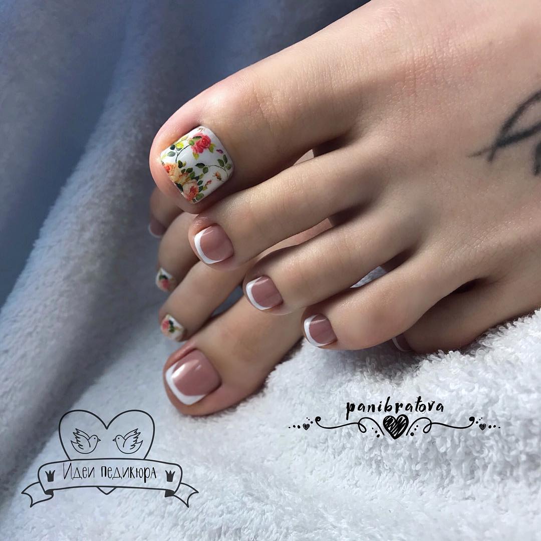 Слайдеры чаще всего используют в летних нейл-артах, ведь они дарят педикюру непередаваемую красоту и нежность. Используйте слайдеры с флористикой, желательно с мелкими полевыми цветами или крупным бутоном, заполняющим все пространство большого пальца. Примеры таких нейл-артов вы можете видеть ниже.