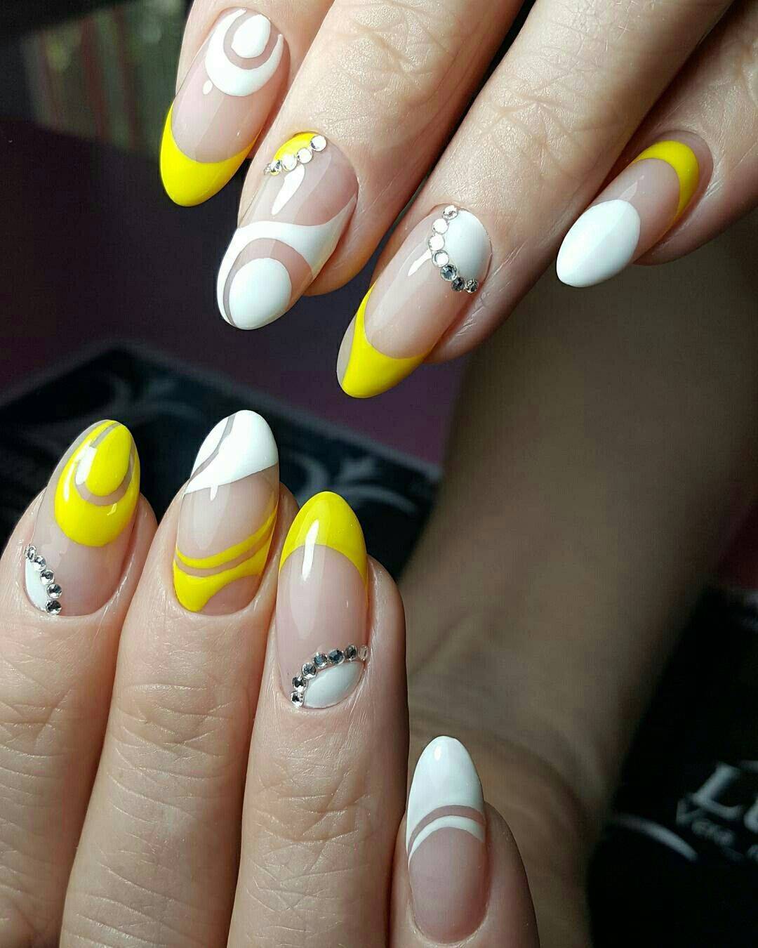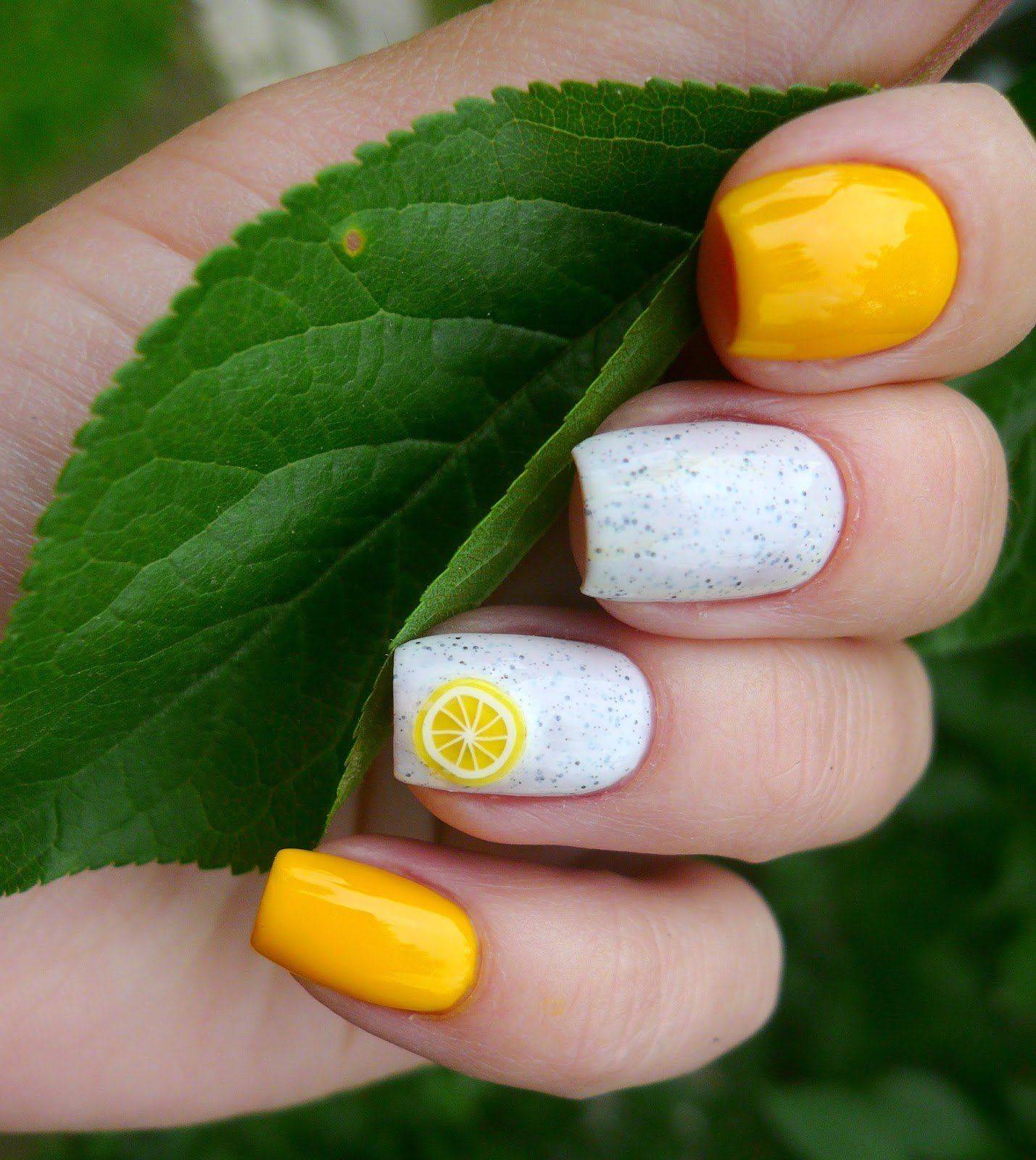 При дизайне ногтей не следует отказываться от рисунков желтым гелем на белом фоне, такой педикюр создает летнее настроение.
