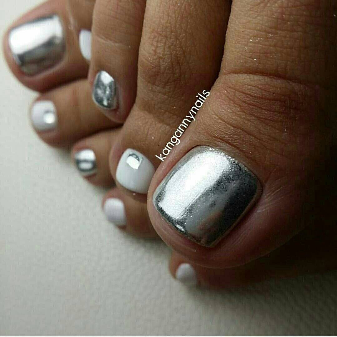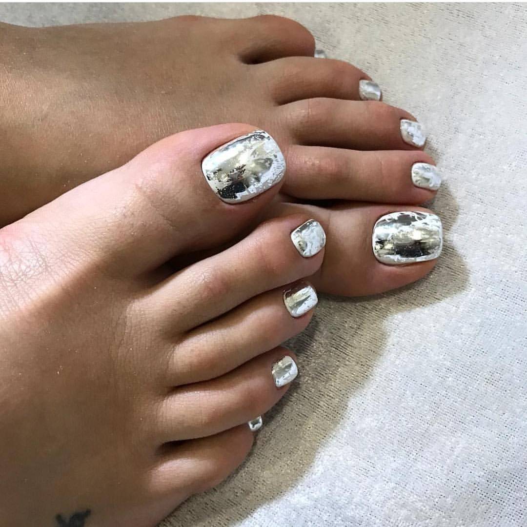 Популярными решением будет французский маникюр и педикюр в металлических оттенках.
