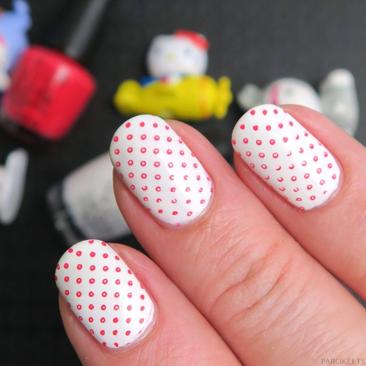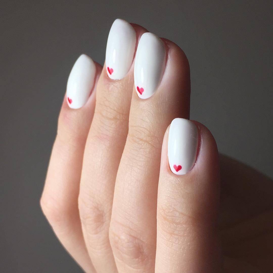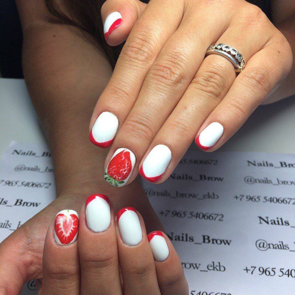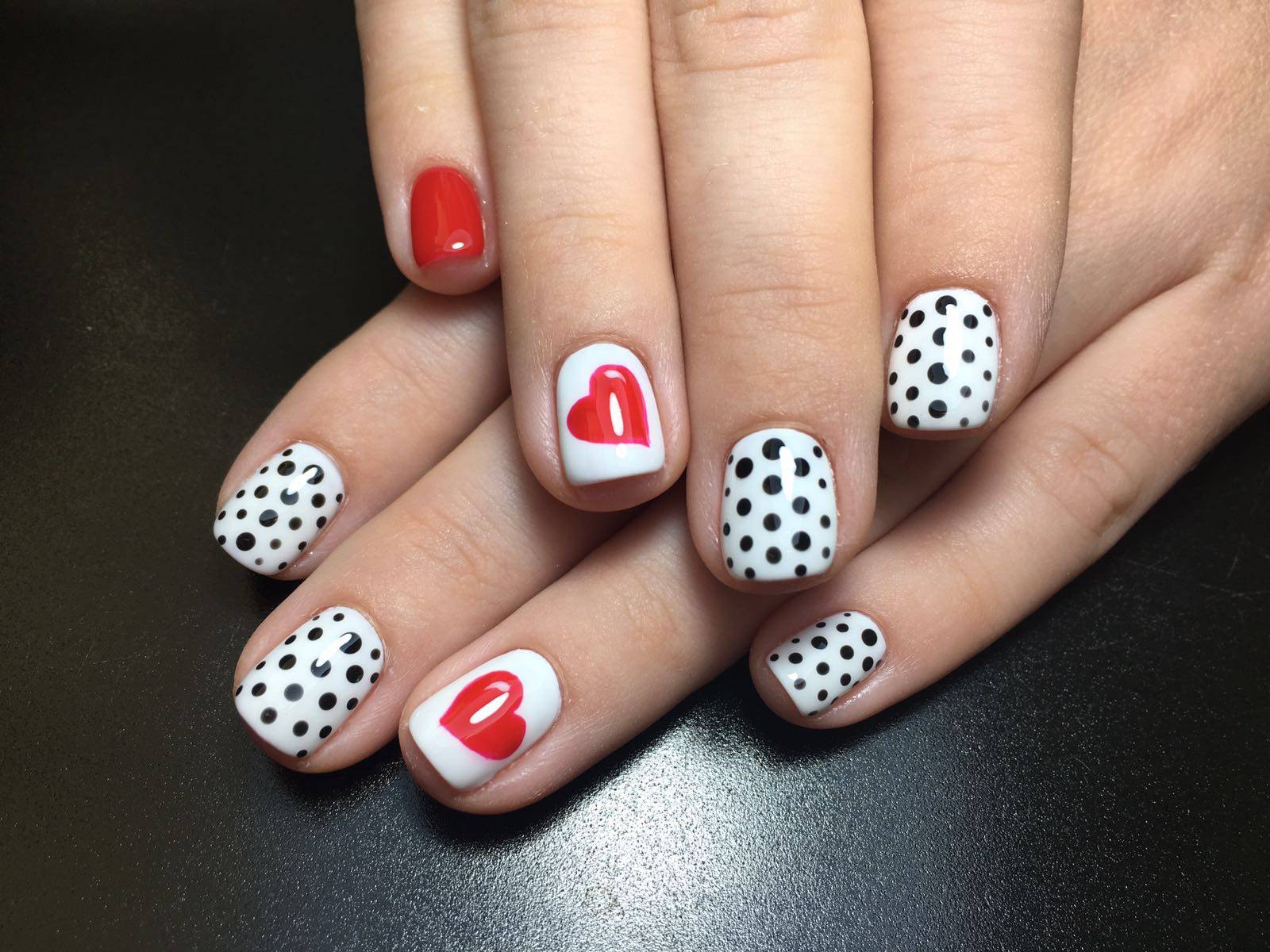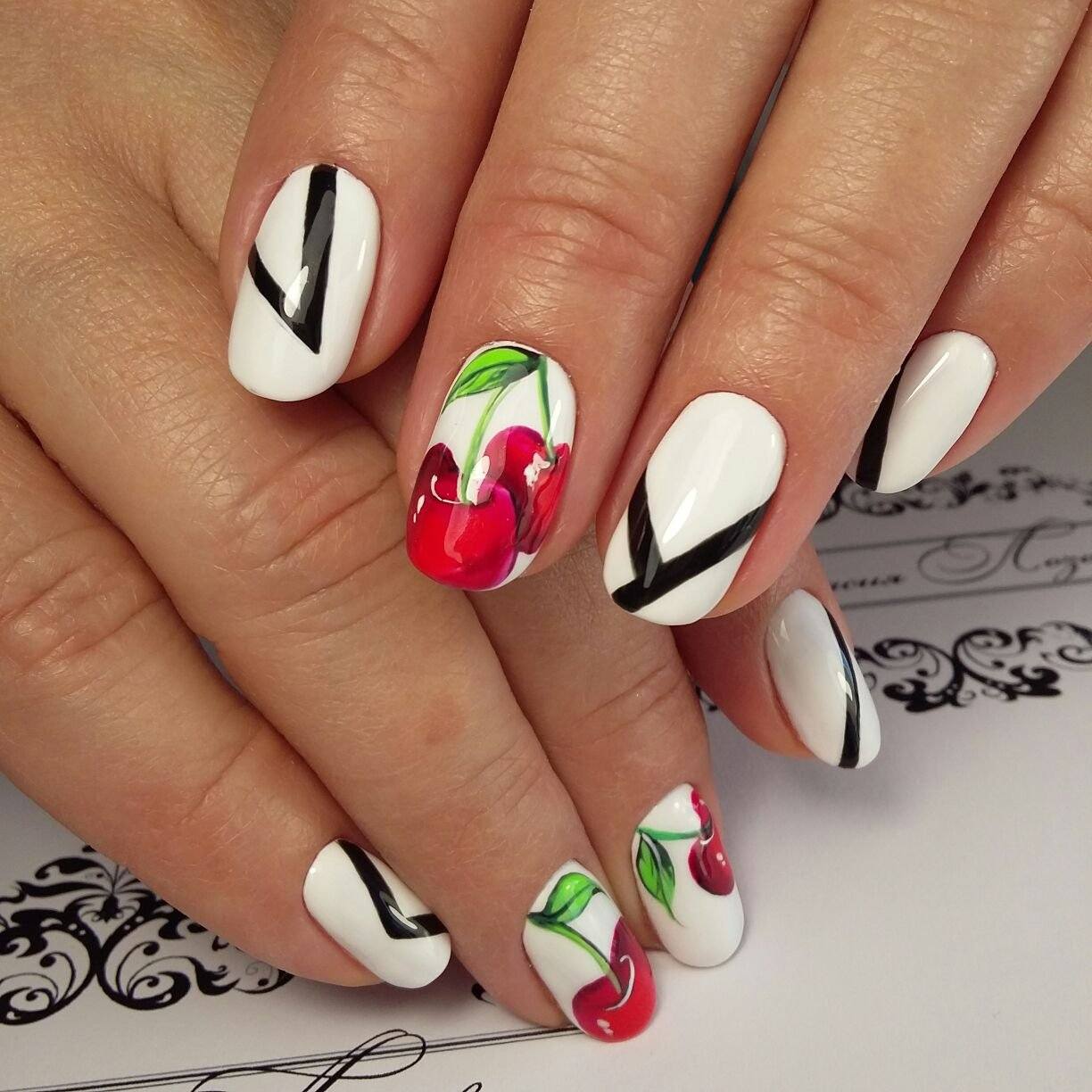 Рисунки на белом фоне красным гелем в виде сердечек, бантиков прекрасно сформирует романтический образ ко Дню святого Валентина, а с рисунком в форме вишенок создастся летний педикюр.