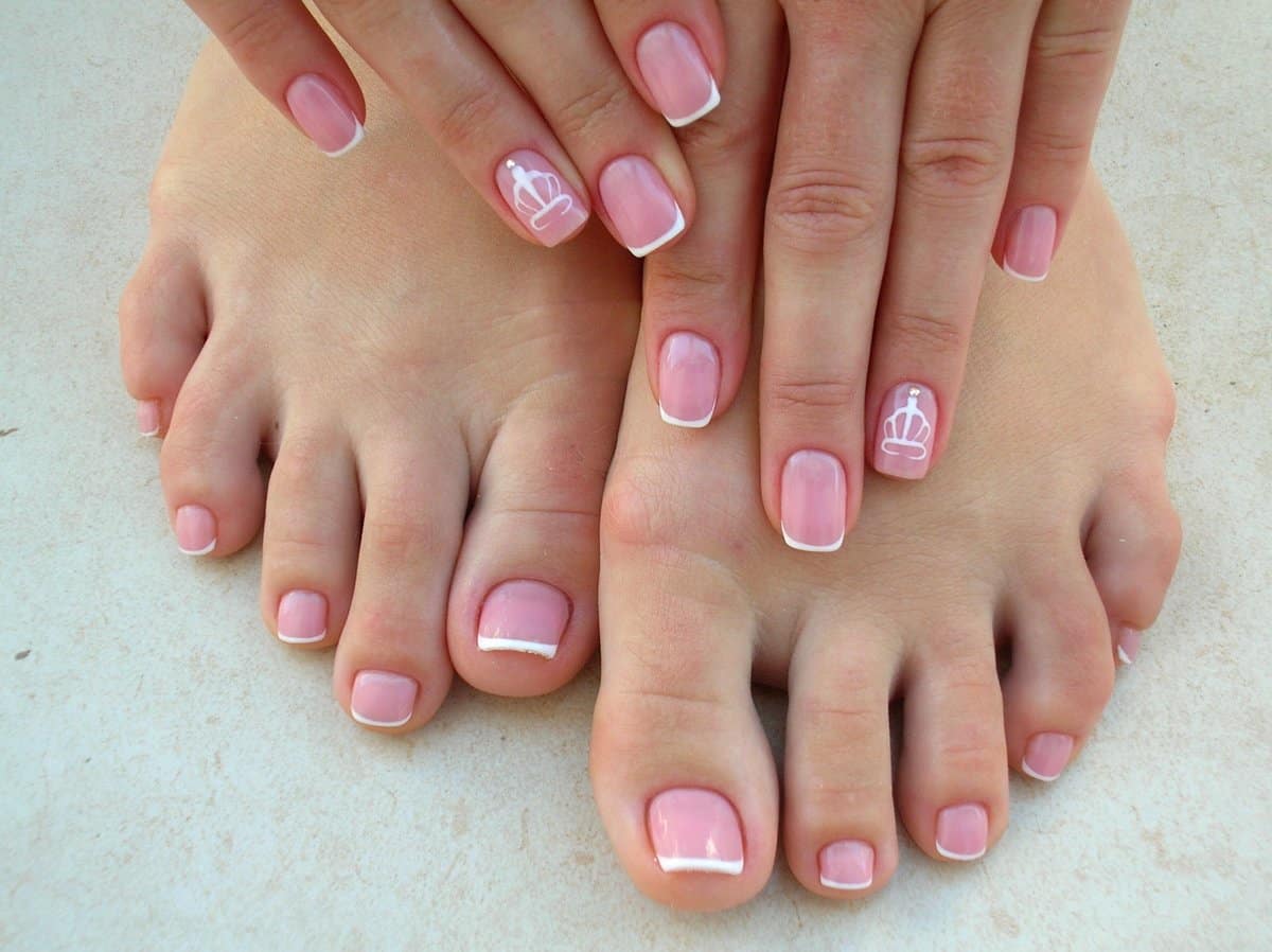 Если вы выбрали французский педикюр и маникюр, вы, несомненно, будете выглядеть очень женственно, а ваши ручки и ножки аккуратно и сдержанно.