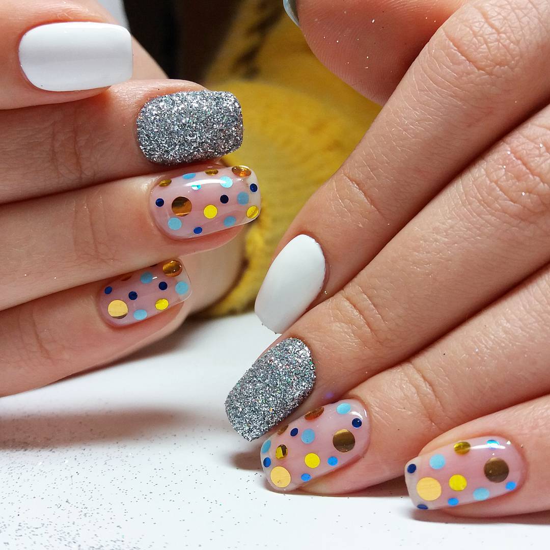 Светлые покрытия выглядят не менее эффектно. Гармоничность нежных оттенков особенно хорошо прослеживается, если использовать бирюзовые, белые, бледно-желтые, пудровые, серые цвета. К таким сочетаниям можно добавить немного блесток или маленьких страз.