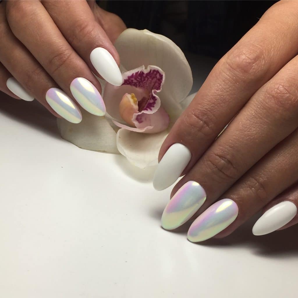 Дизайн втиркой пользуется огромной популярностью среди девушек, ведь это удивительно красивый и нежный материал, который изумительно красиво выглядит на белом фоне. Используйте для дизайна жемчужную втирку, которая подарит вашим ноготкам безумно красивые переливы драгоценных камней.