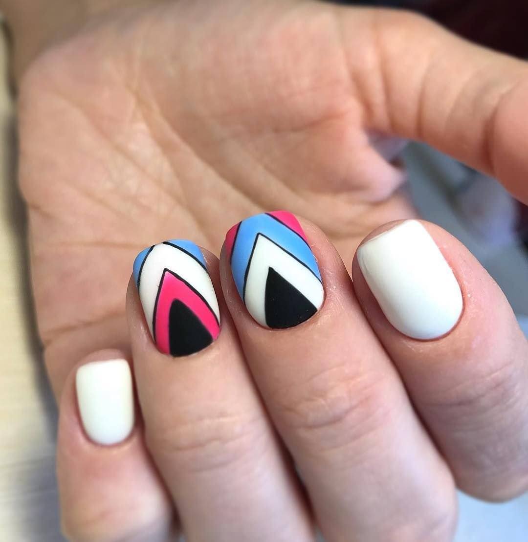 Особой популярностью для коротких ноготков пользуется абстракция. Этот вид дизайна не имеет особых рамок и запретов. Поэтому каждая девушка может выбирать то, что ей по душе. Ведь рисунок может занимать всю ногтевую пластину на одном или нескольких ноготках. Также в некоторых случаях его совмещают с негативным пространством. В результате чего маникюр в оформлении больше напоминает стиль минимализм.