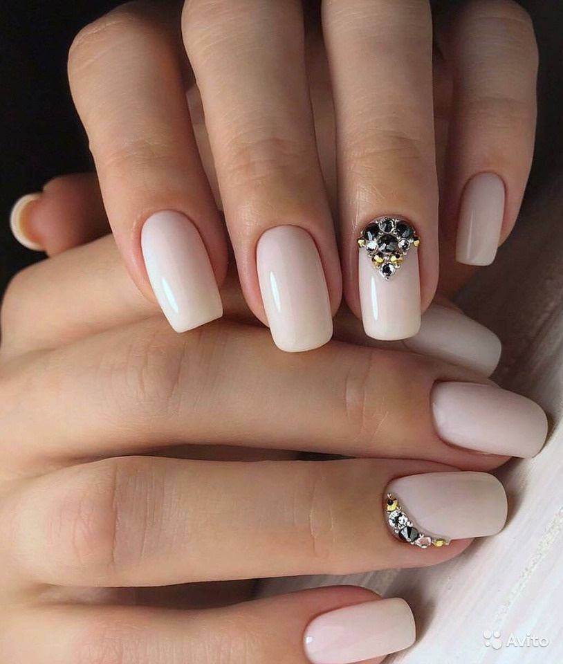В однотонном маникюре стразы обычно располагают в прикорневой зоне. Так маникюр будет смотреться гармонично, стразы не будут мешаться в повседневном быту. Для дизайна ногтей используйте прозрачные, черные, красные, голубые стразы. Эффектно смотрится декор прикорневой зоны бульонками