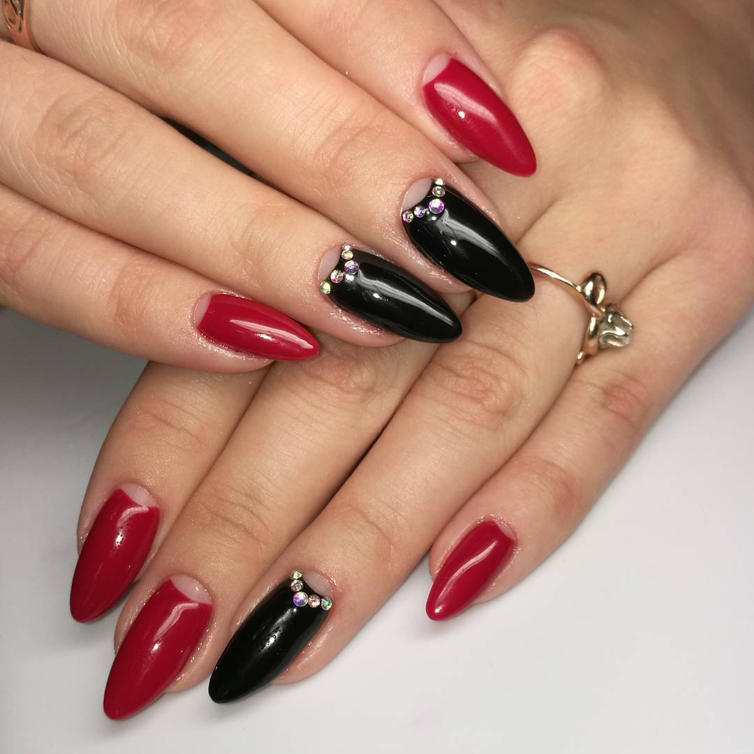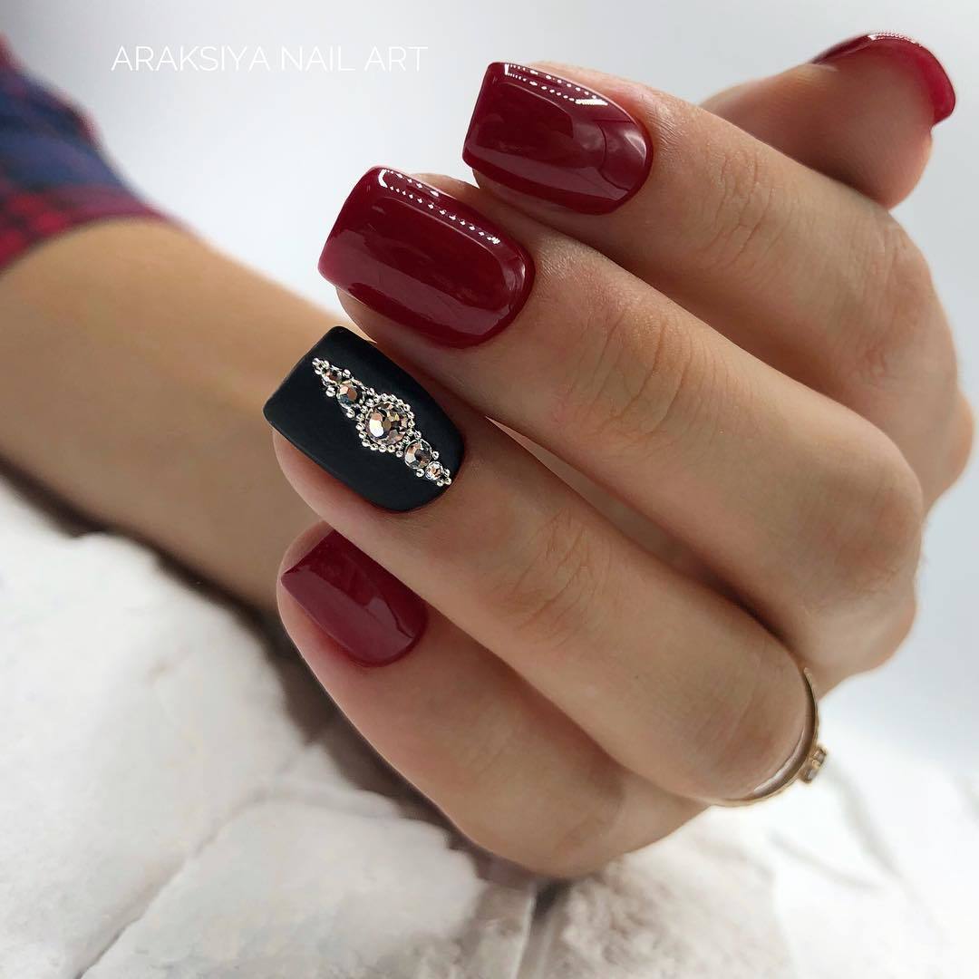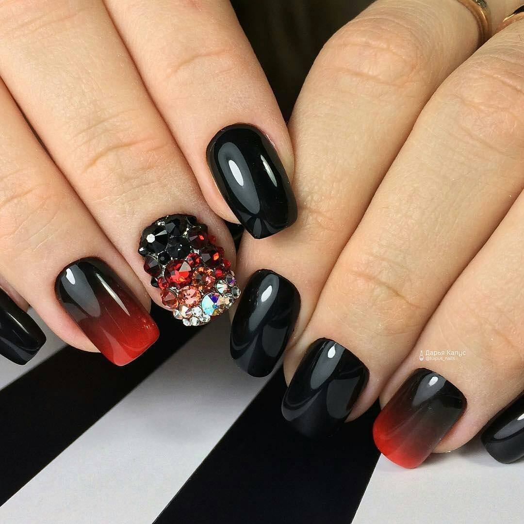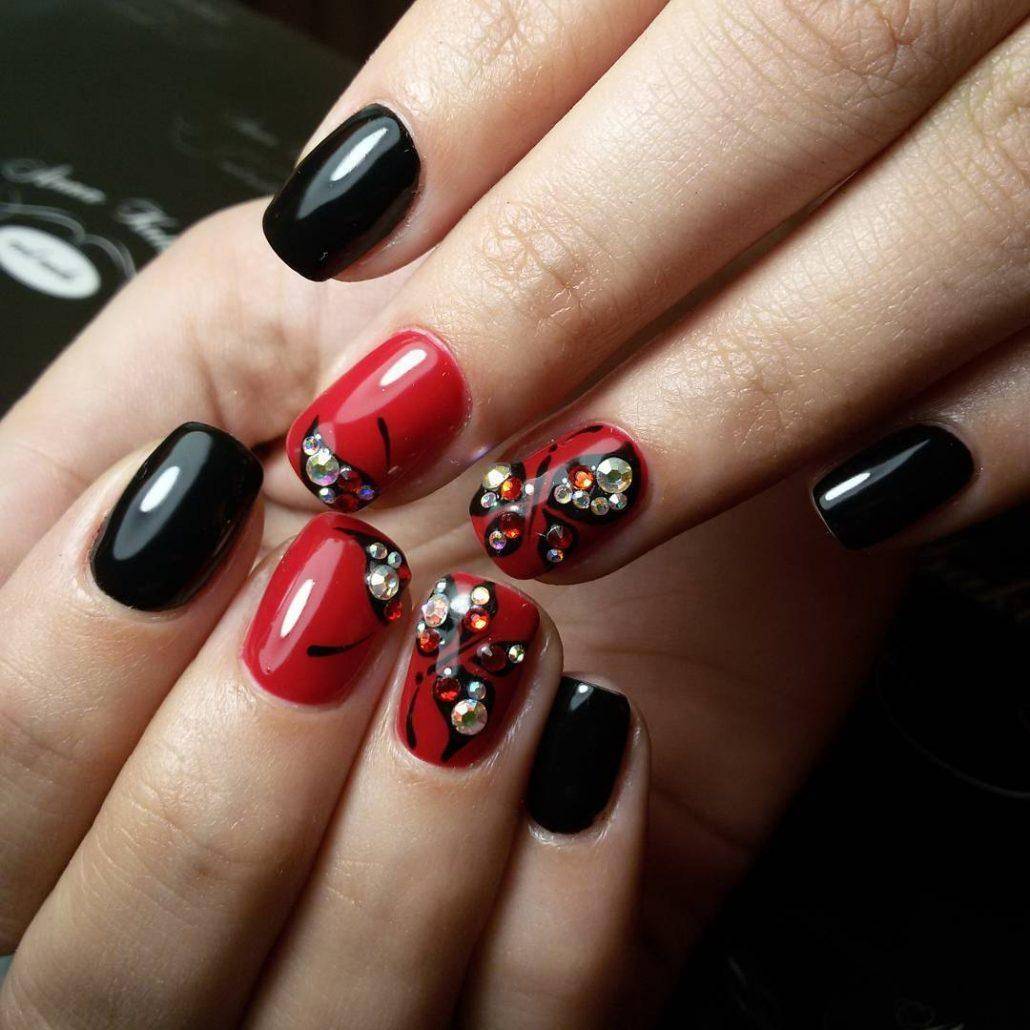 Черно-красный маникюр создает контрастный, но гармоничный дуэт. Черно-красный маникюр – это сочетание для темпераментных, эмоциональных и страстных девушек. Дизайн ногтей подойдет на все случаи жизни. Отлично сочетается со строгим деловым костюмом, так и с праздничным нарядом. Черно-красный маникюр может быть выполнен со стразами или же можно сделать эффектный градиент.