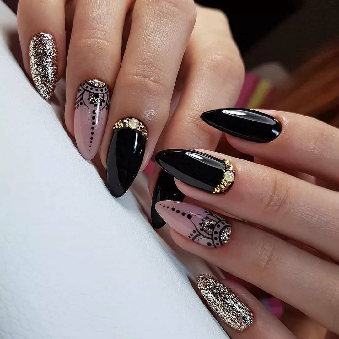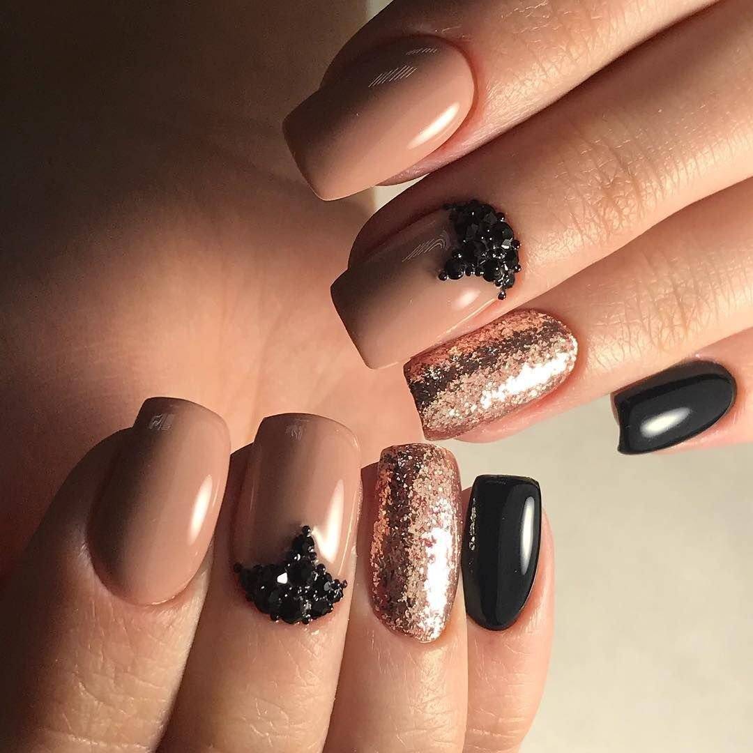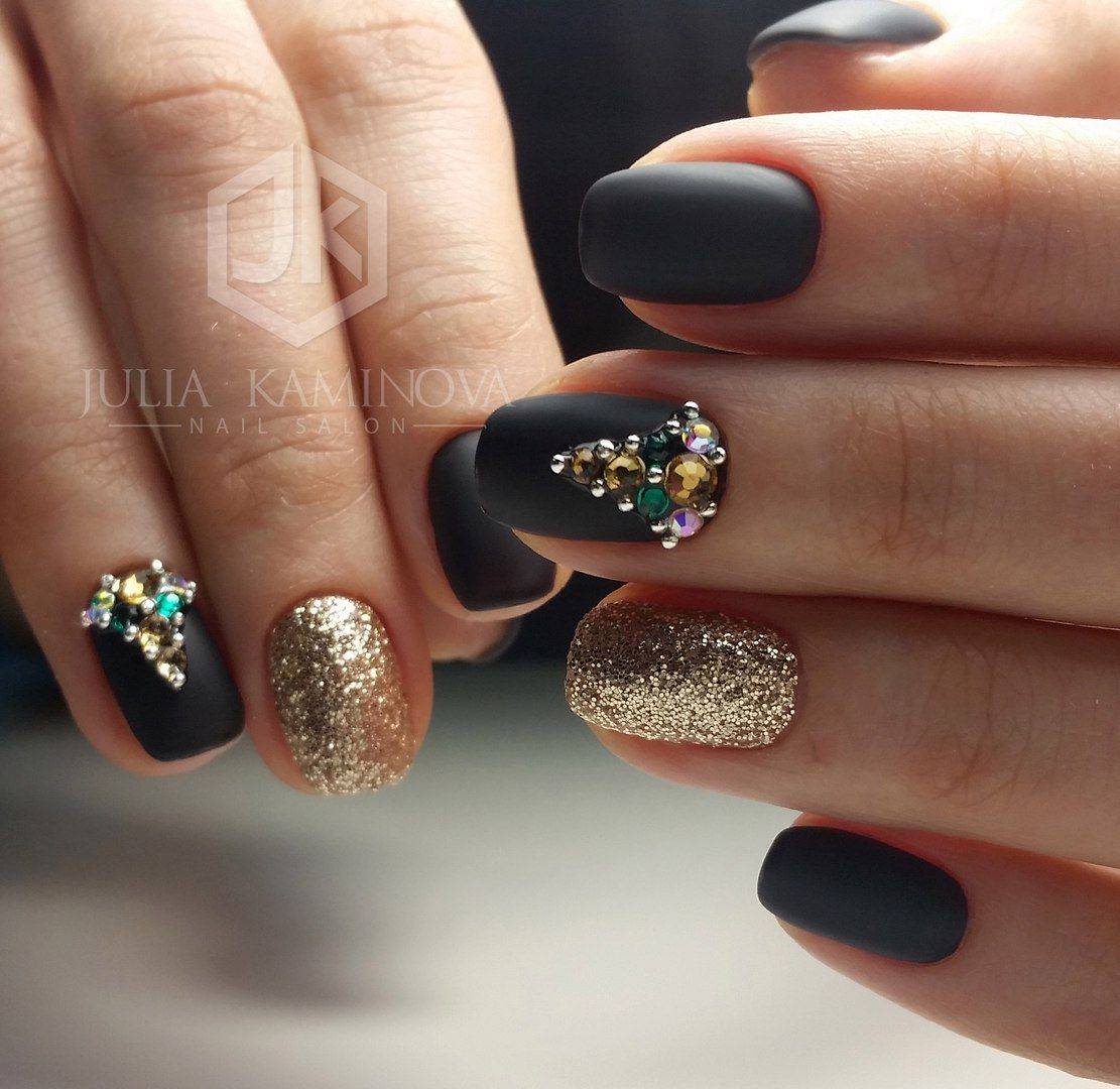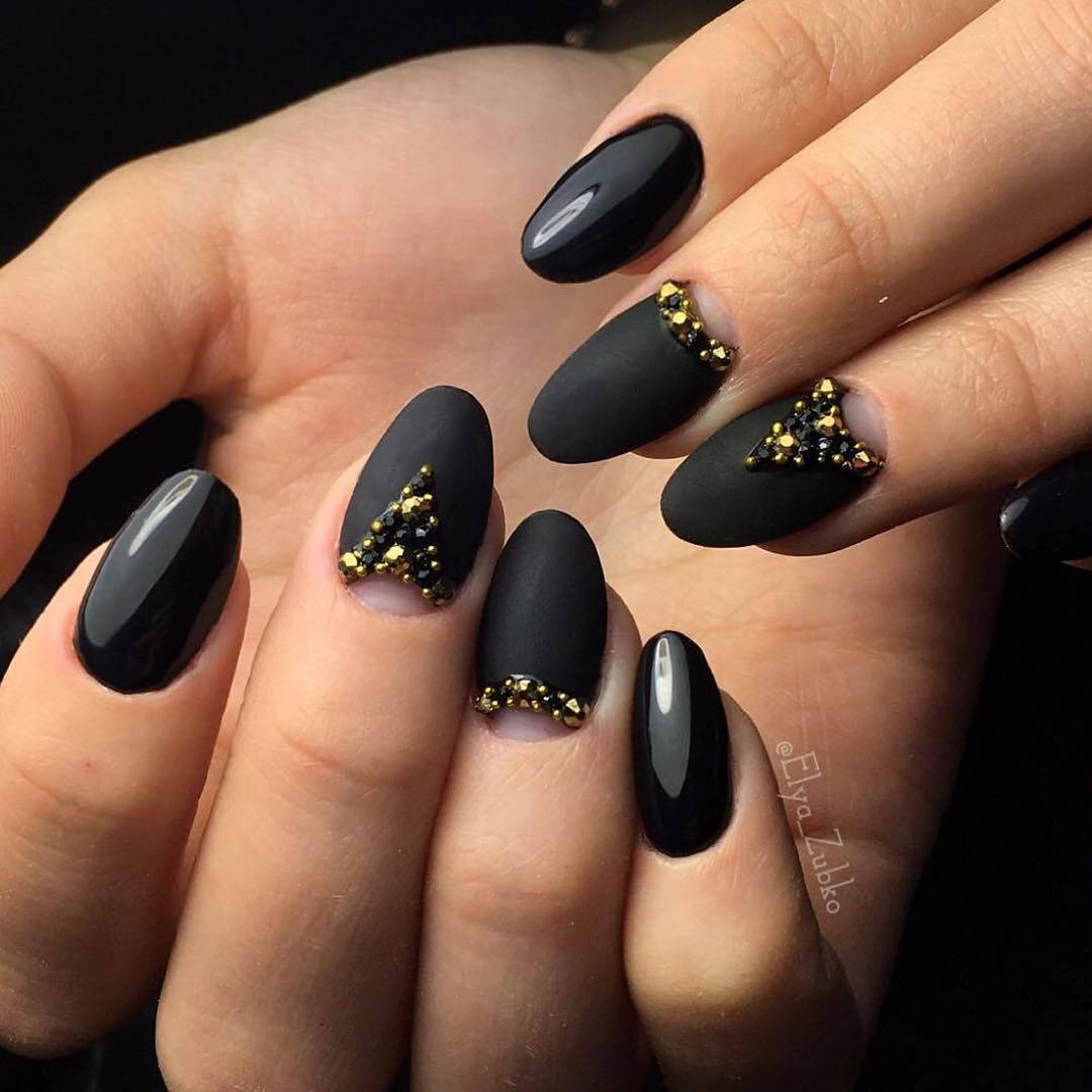 На черном бархатном фоне шикарно смотрятся золотые стразы. Помимо стразов используйте золотой глиттер или пайетки. Черное золото – идеальный вариант для торжественного декора ногтей. Подобные нейл-арты также можно вписать в повседневные луки, при условии, что золотого декора будет по-минимуму.