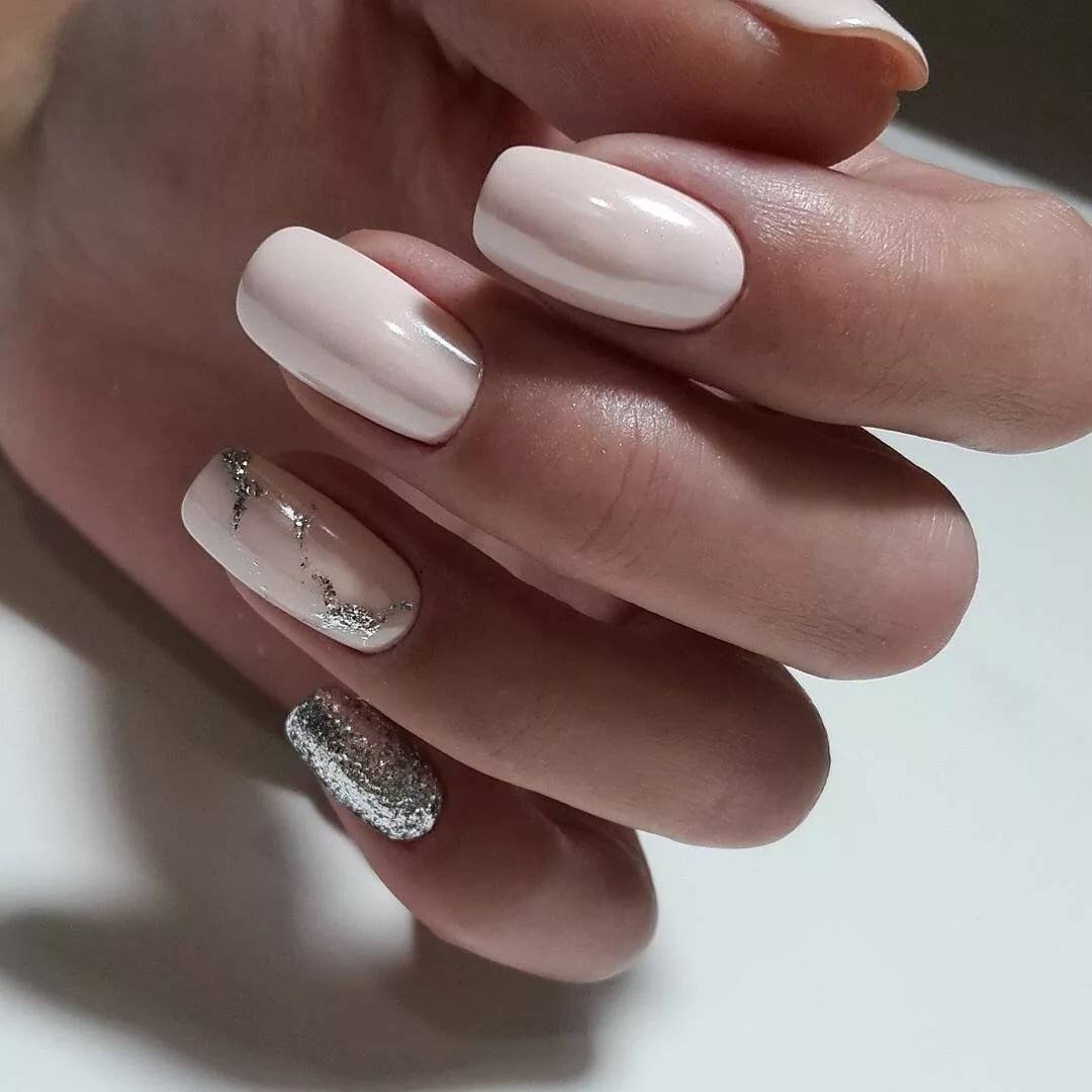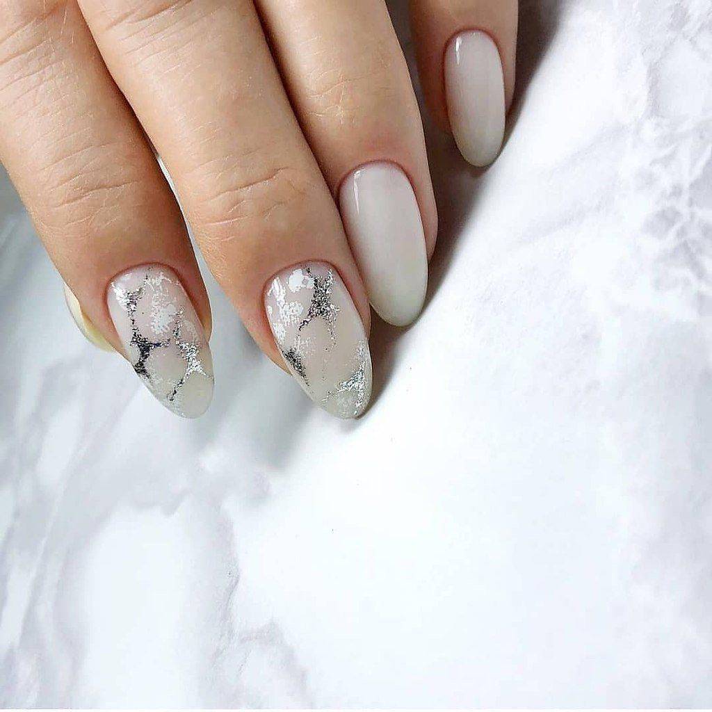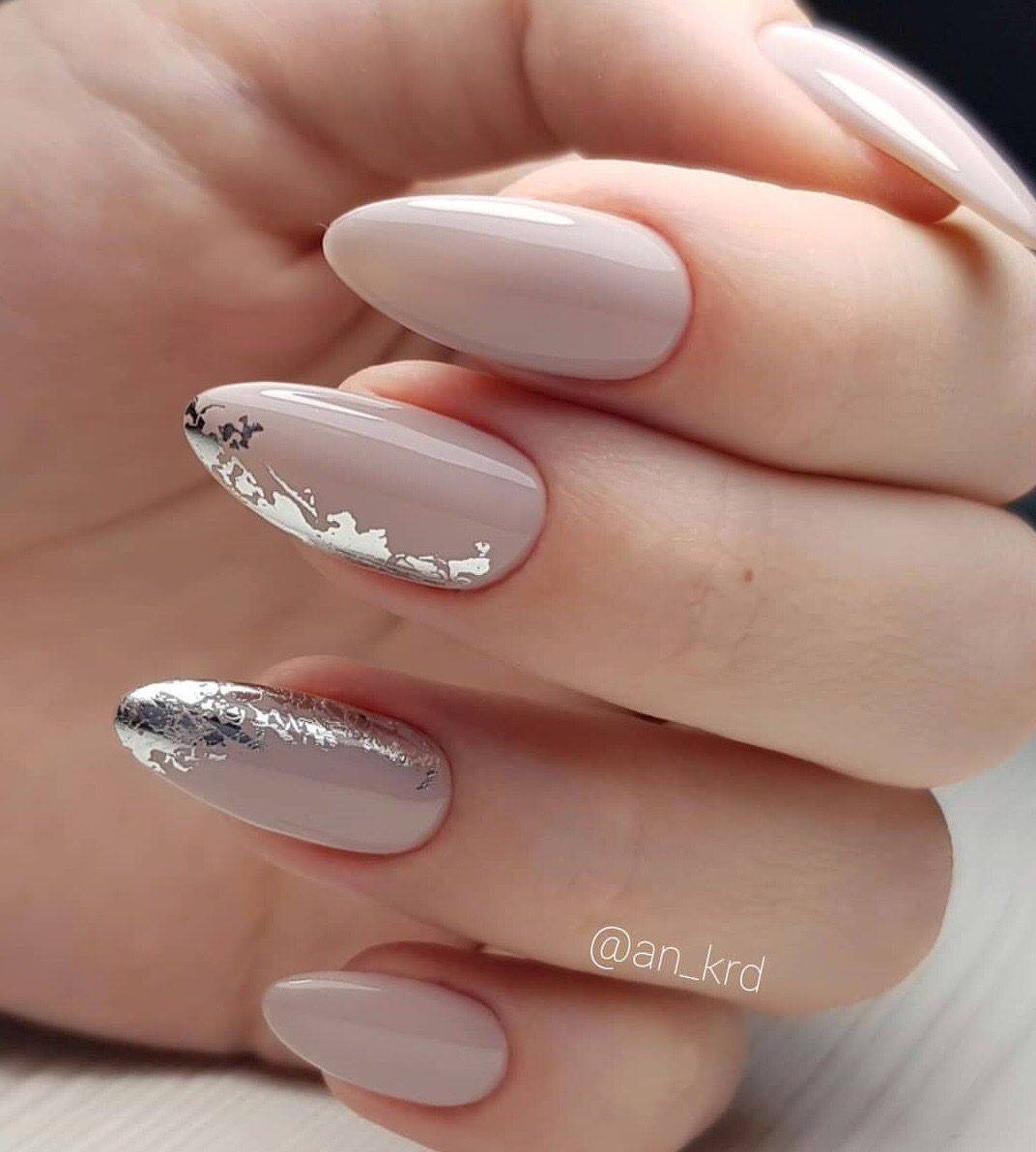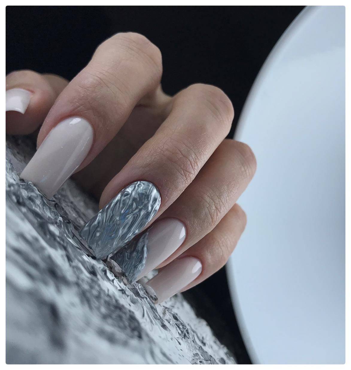 - А вот нежнейшие нюдовые оттенки, украшенные серебристой фольгой, создадут на ногтях эффект зеркально-металлических капель.