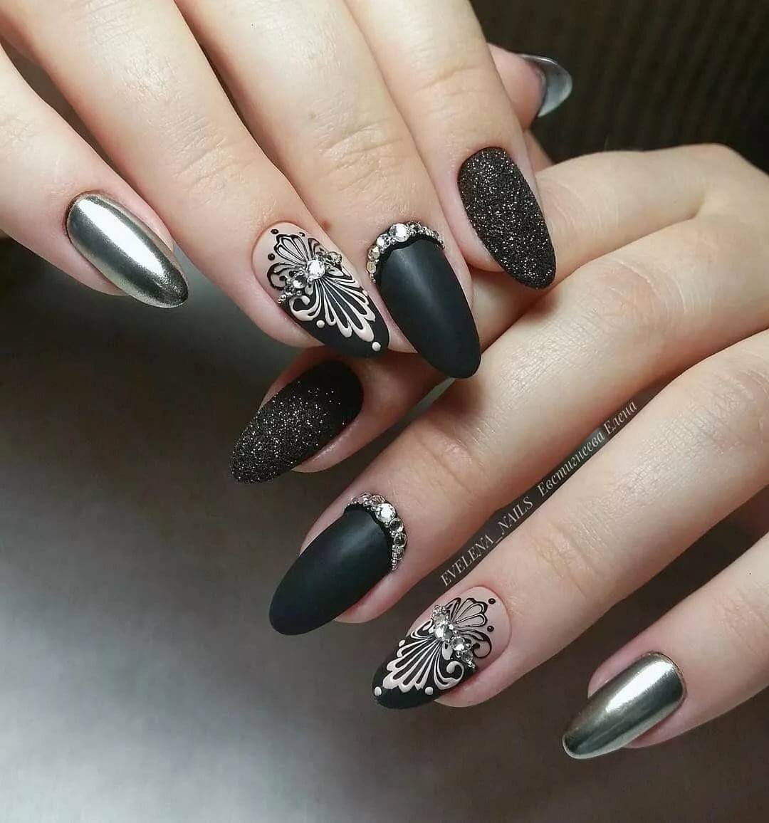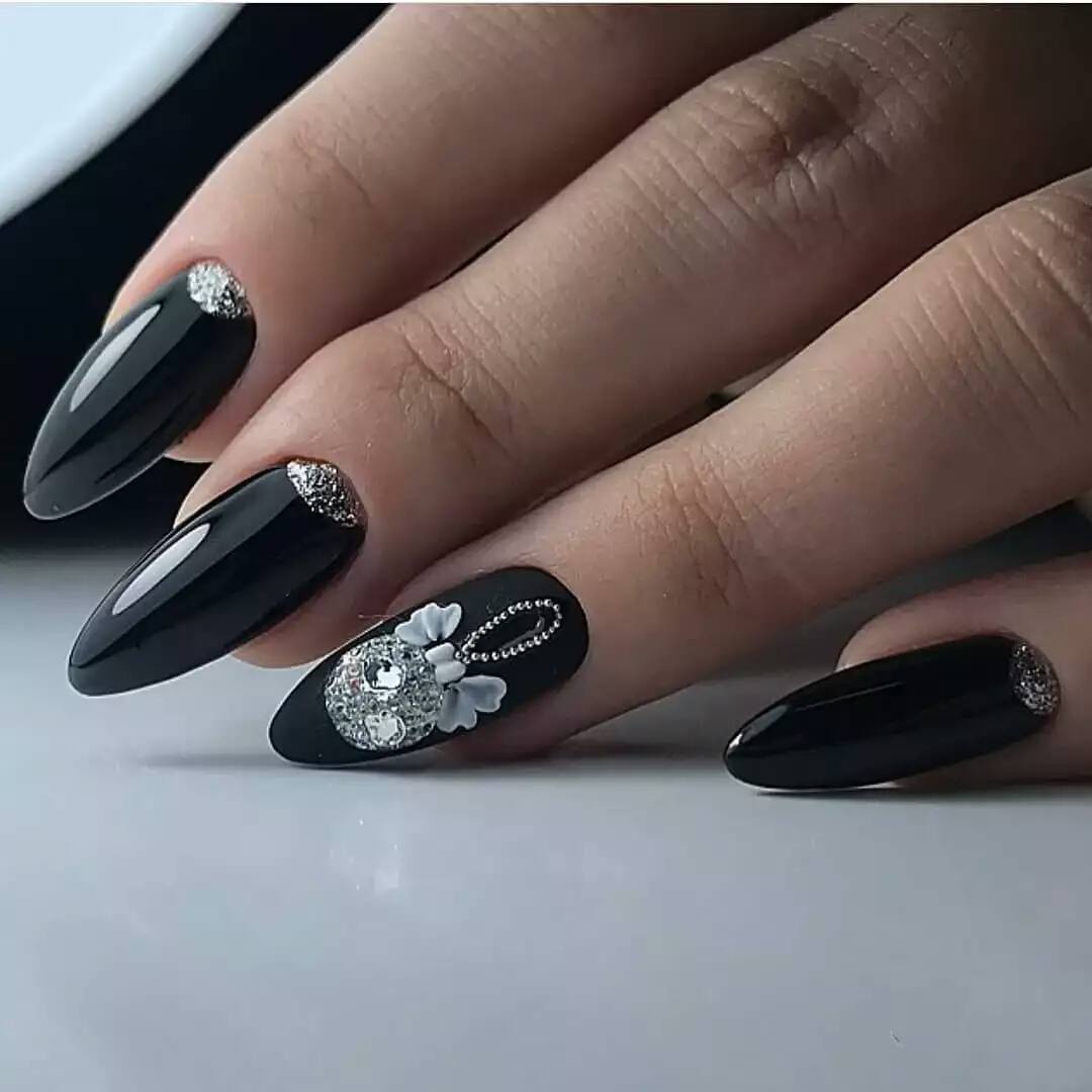 Чтобы смягчить черный дизайн ногтей используйте матовое покрытие, декор с меланжем, серебряным глитером. Стразы, бульонки и кристаллы используются для выделения прикорневой зоны, геометрического и цветочного декора. В торжественных образах шикарно смотрится дизайн с инкрустацией стразами. Для маникюра можно использовать как прозрачные серебряные стразы, так и черные камни.