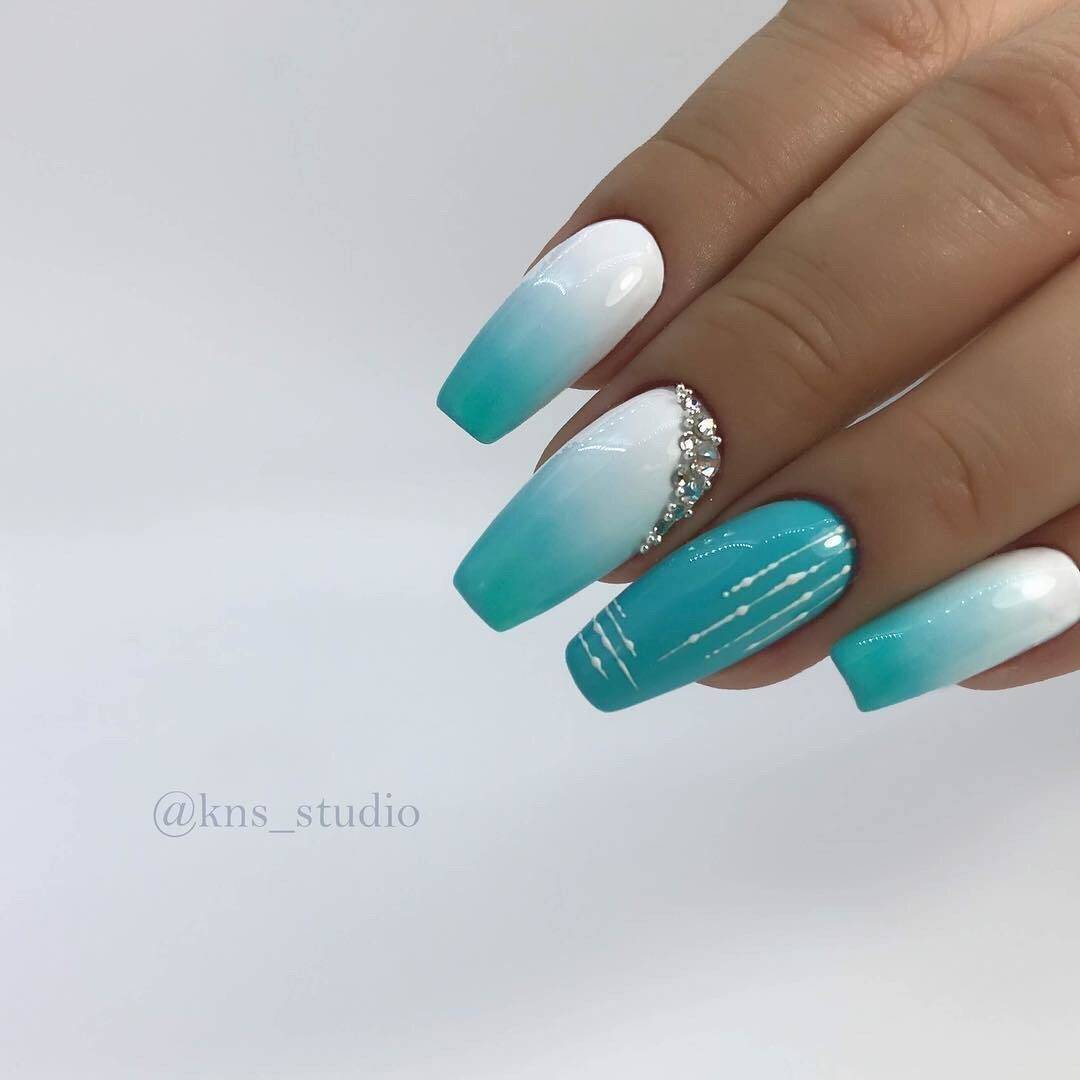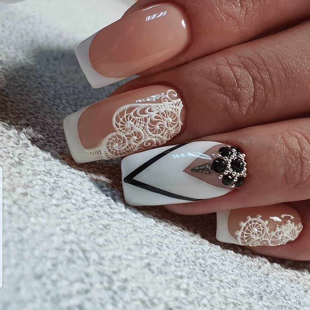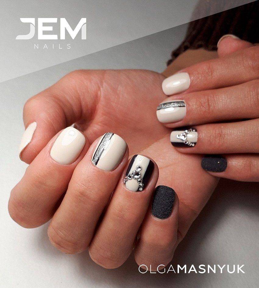 Их можно нанести на все ноготки, украсив стразами контрастного черного цвета, либо скомбинировать с техниками френч, лунным дизайном, лаконичными геометрическими рисунками, омбре.